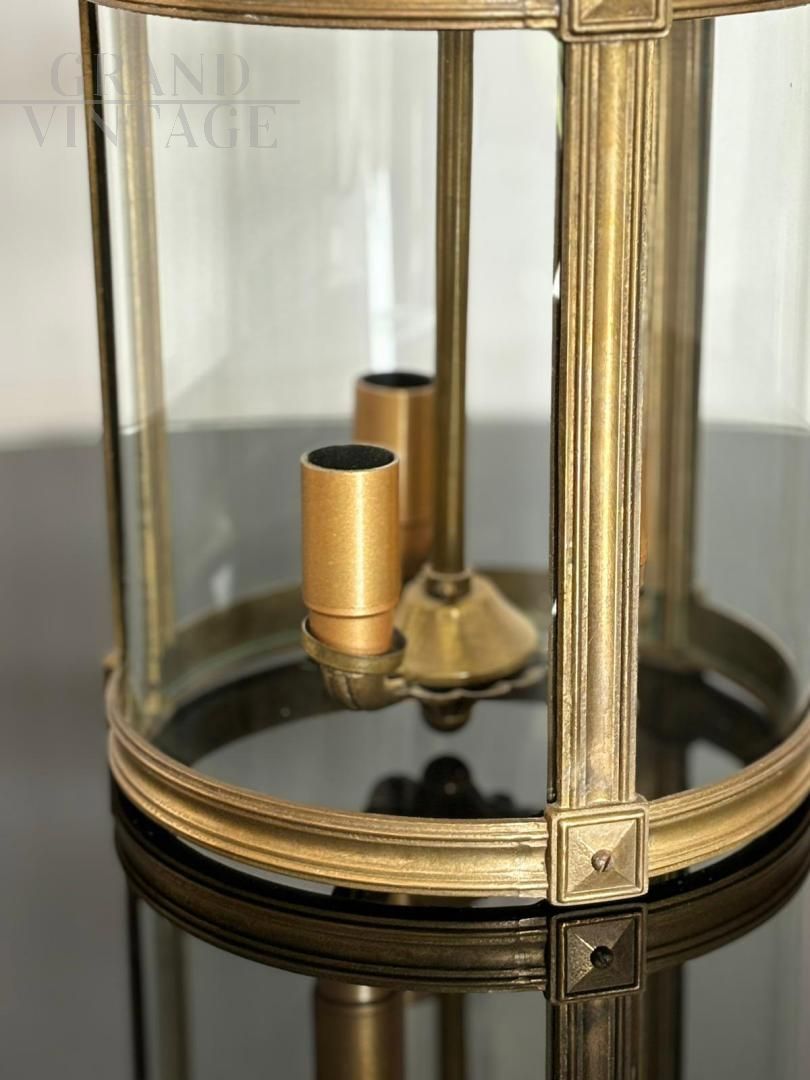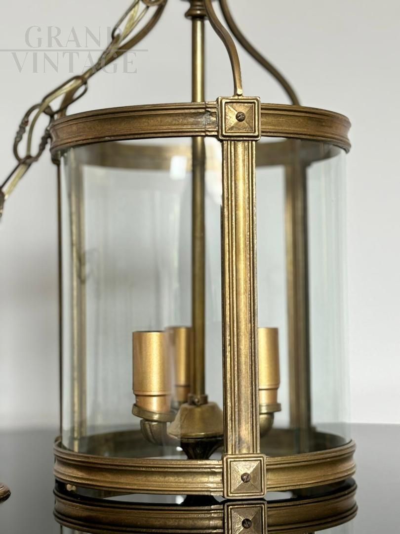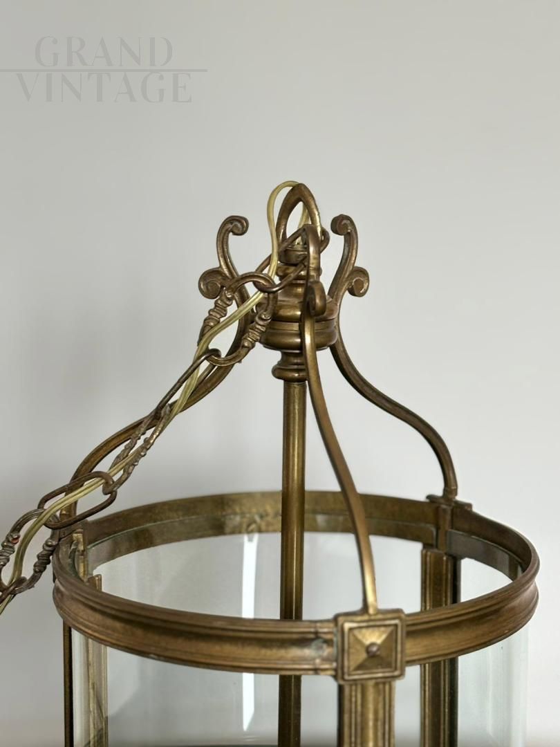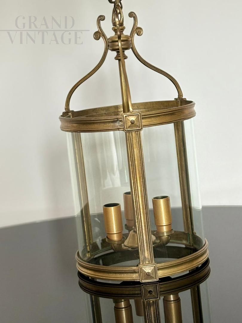 Lampadario a lanterna vintage in ottone e vetro soffiato, Italia anni '50
