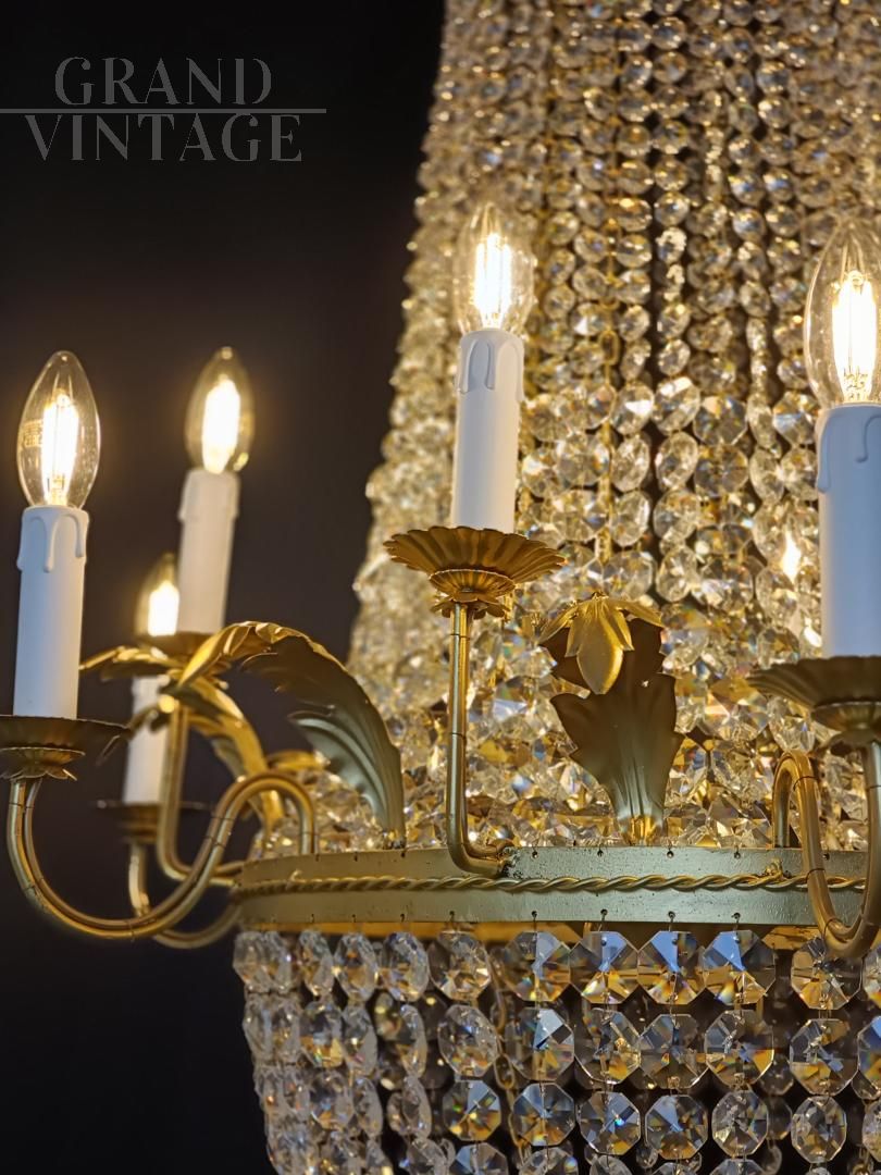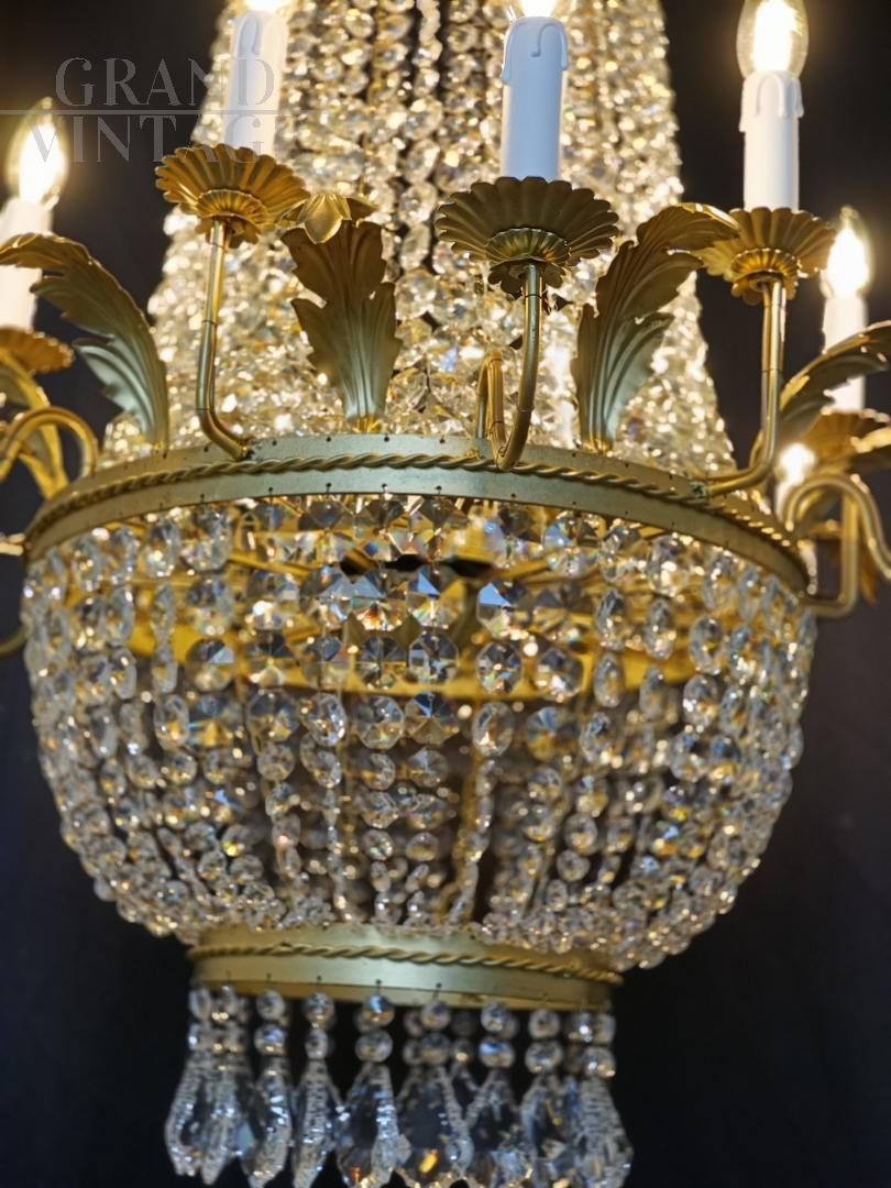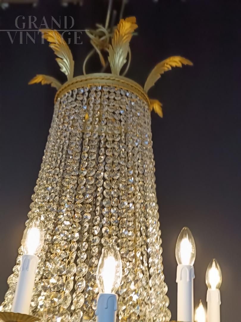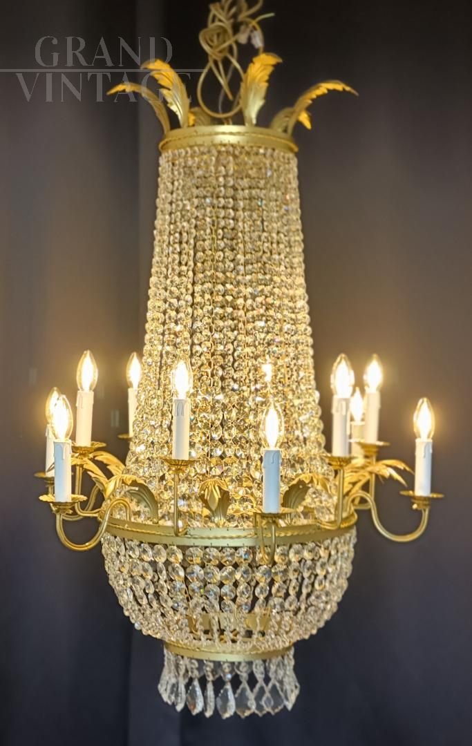 Lampadario francese a mongolfiera in stile Impero con gocce di cristallo e finitura dorata, composto da 12 punti luce a candela.