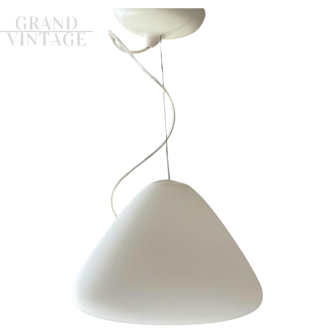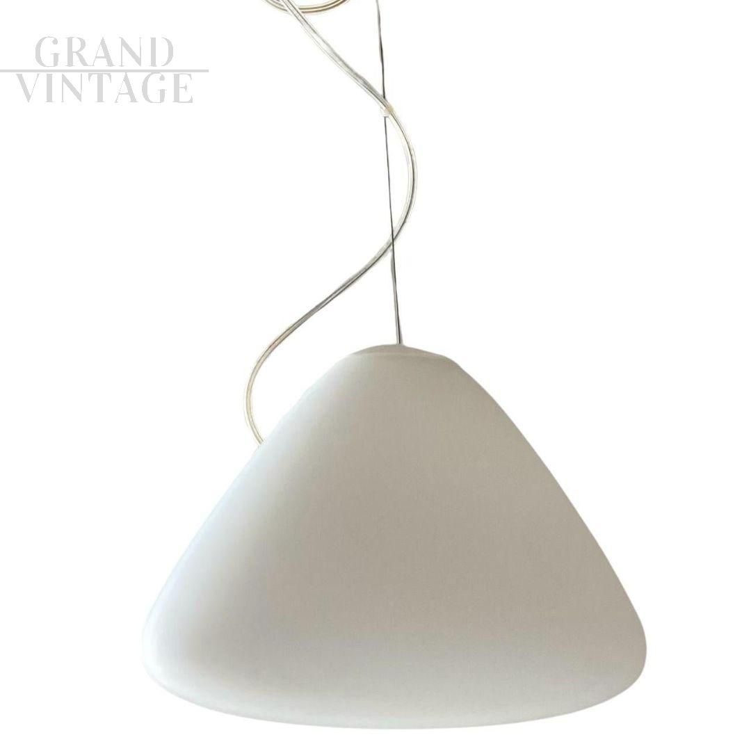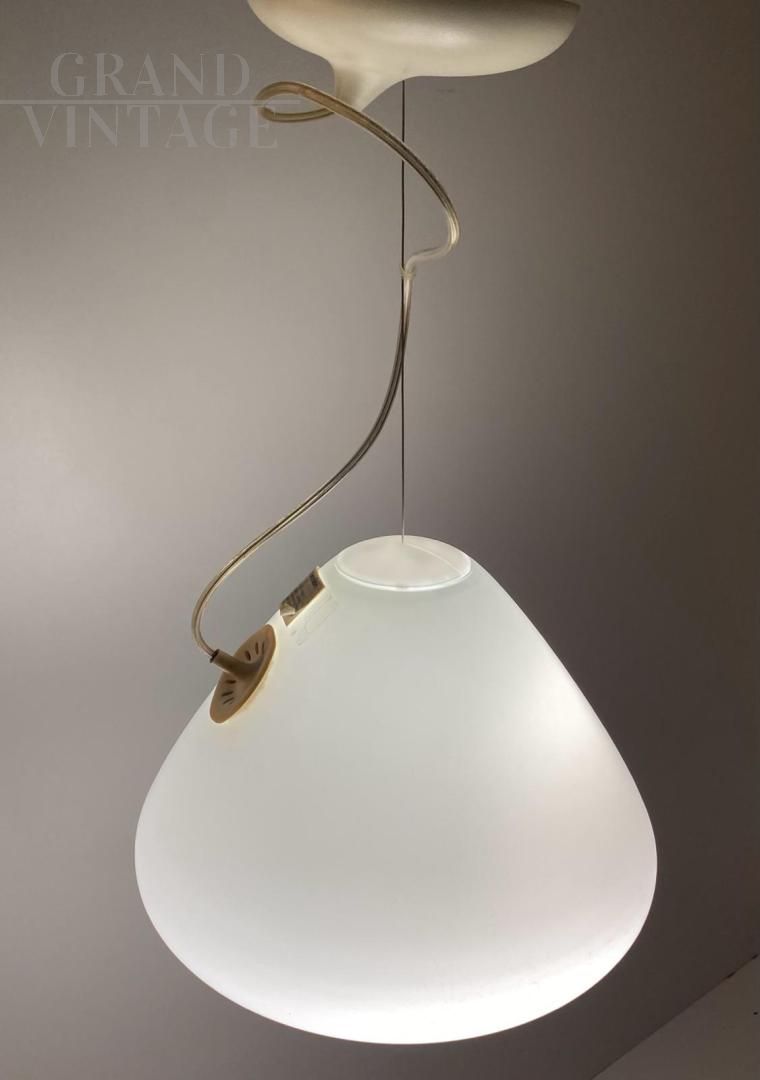 Lampadario lampada a sospensione Capsule disegnato da Ross Lovegrove per Artemide, Italia 2010, in vetro soffiato acidato. Progettato e lanciato nel 2010, come dice il nome, questo capolavoro di design è costituito da una capsula di luce che estrae una nuova forma dal processo di lavorazione manuale del vetro. Ideato per celebrare il 40° anniversario dello sbarco dell'Apollo 11 sulla Luna. Materiali: diffusore in vetro soffiato acidato; supporto portalampada in gomma siliconica.