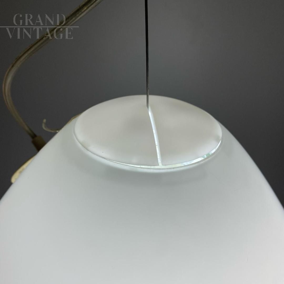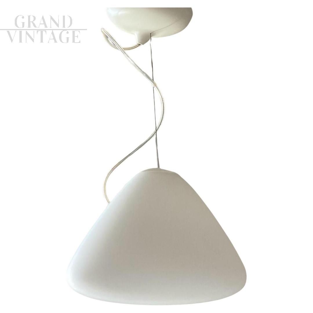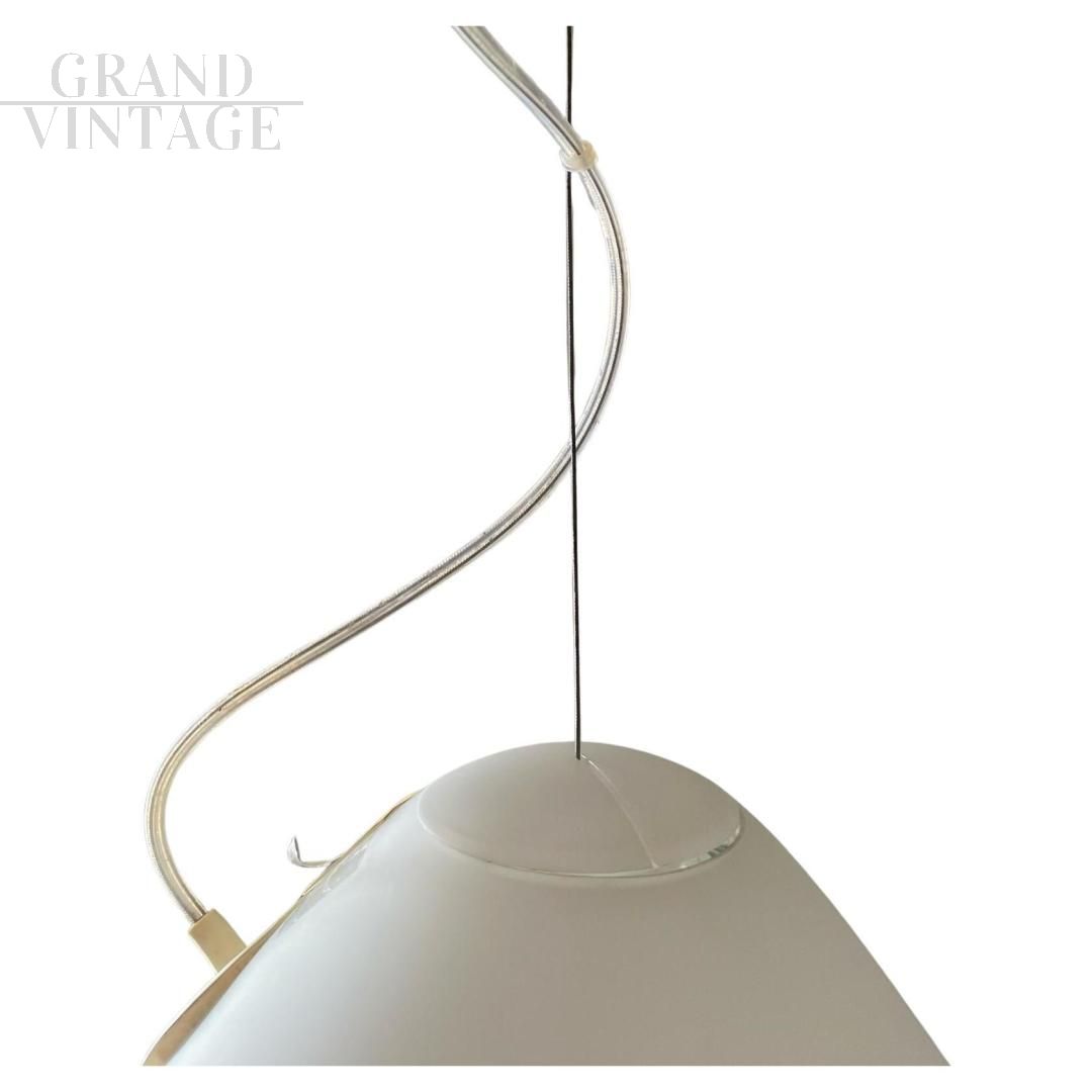 Lampadario lampada a sospensione Capsule disegnato da Ross Lovegrove per Artemide, Italia 2010, in vetro soffiato acidato. Progettato e lanciato nel 2010, come dice il nome, questo capolavoro di design è costituito da una capsula di luce che estrae una nuova forma dal processo di lavorazione manuale del vetro. Ideato per celebrare il 40° anniversario dello sbarco dell'Apollo 11 sulla Luna. Materiali: diffusore in vetro soffiato acidato; supporto portalampada in gomma siliconica.
