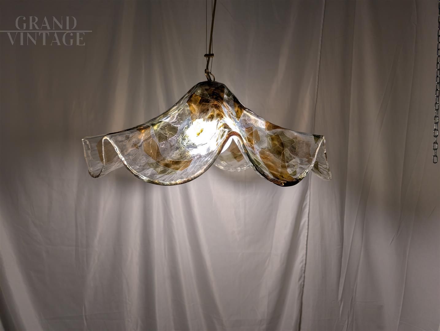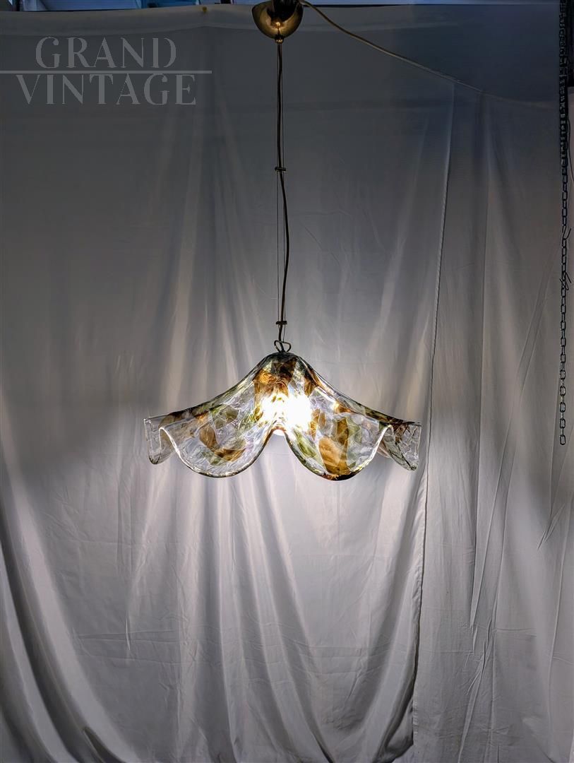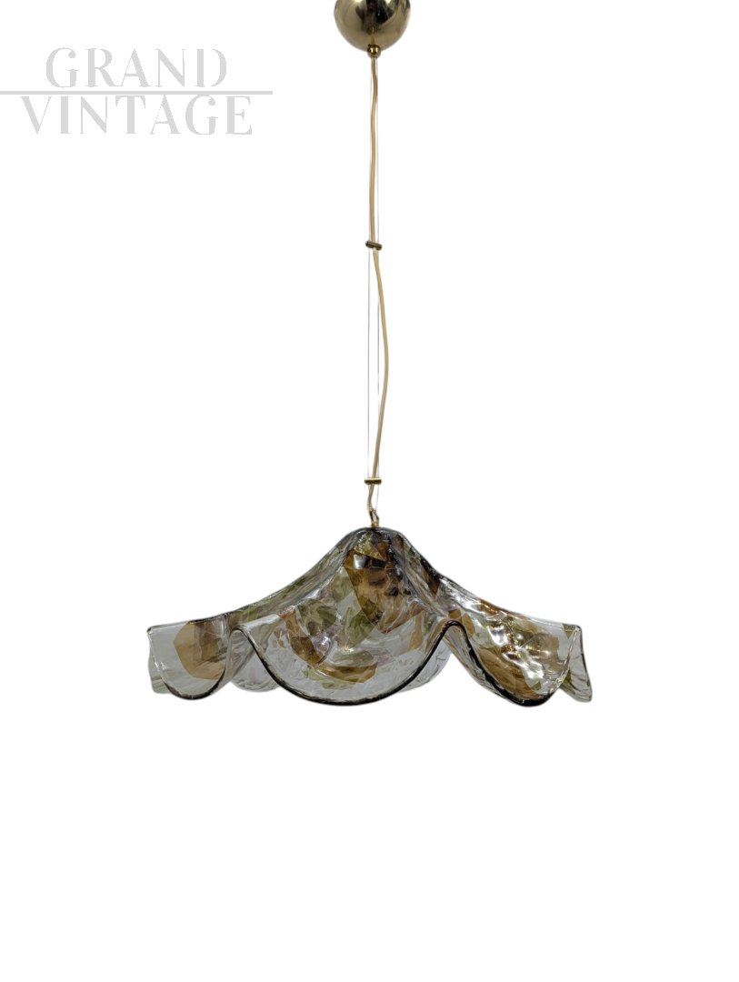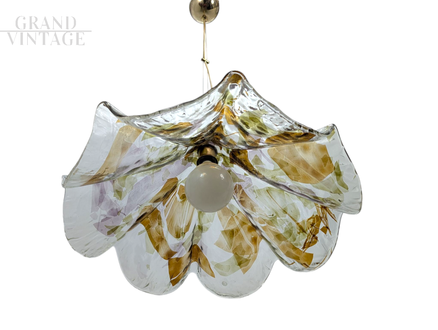 Lampadario a sospensione La Murrina in vetro di Murano. La sua struttura ondulata richiama la forma di un fiore aperto o di un tessuto mosso dal vento, con un raffinato gioco di curve che dona leggerezza e dinamismo all'intero elemento. Realizzato in vetro soffiato trasparente con inclusioni multicolore nelle tonalità dell’ambra, verde oliva e oro, questo lampadario è un esempio dell’eccellenza artigianale muranese. Il vetro è spesso e lavorato con texture leggere che rifrangono la luce in modo delicato, creando atmosfere calde e sofisticate. Al centro, un portalampada semplice con attacco a vite ospita una lampadina a vista, completando il design senza appesantirlo.