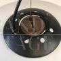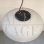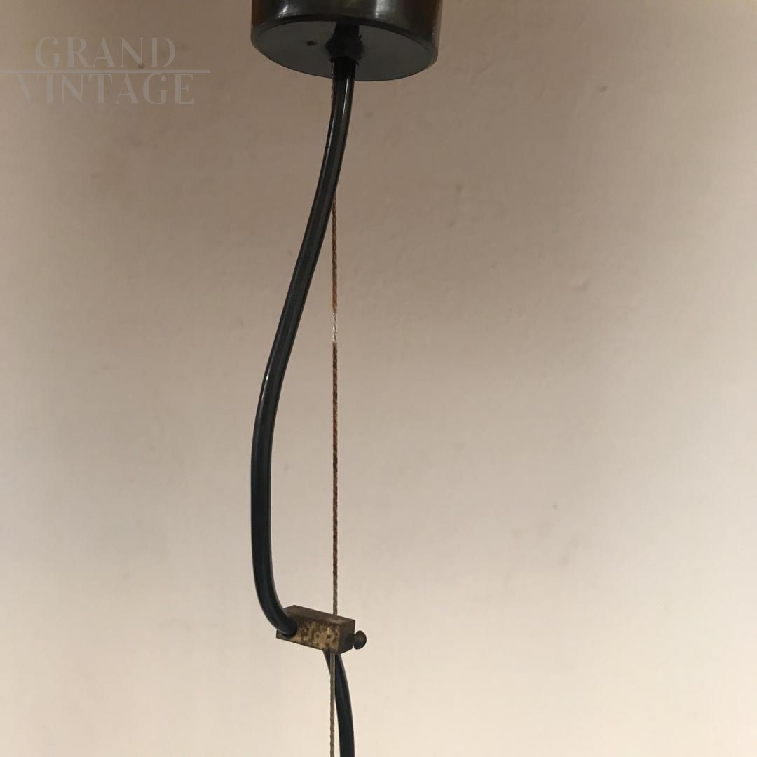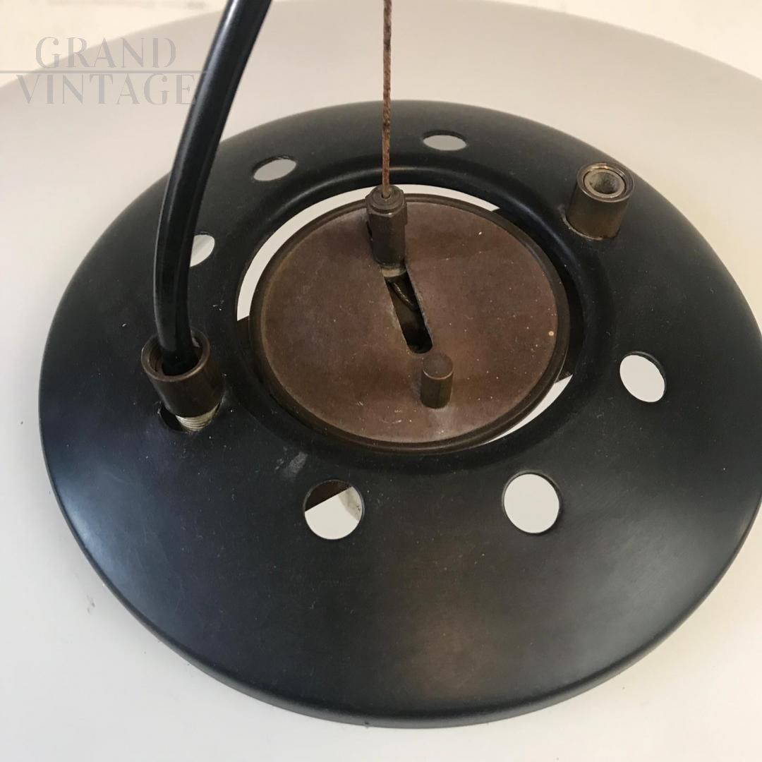 Lampada a sospensione Ufo Stilnovo, modernariato anni '60, in ottone laccato nero e vetro opalino.