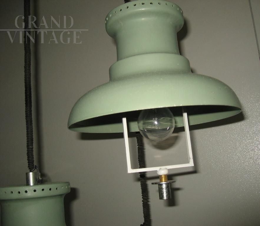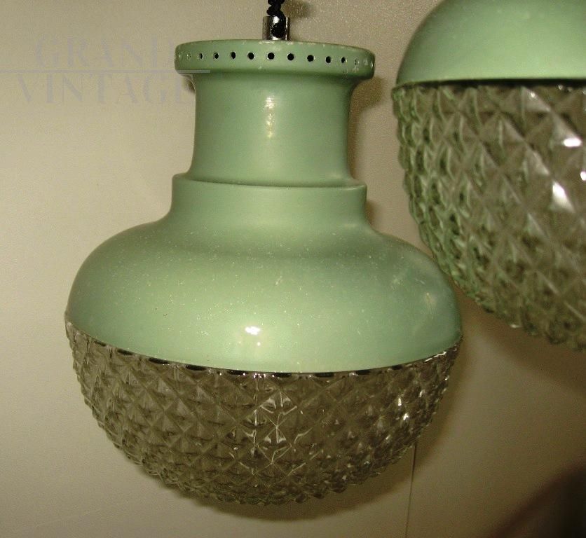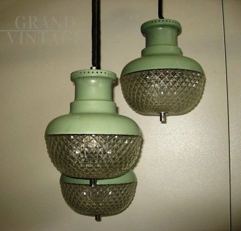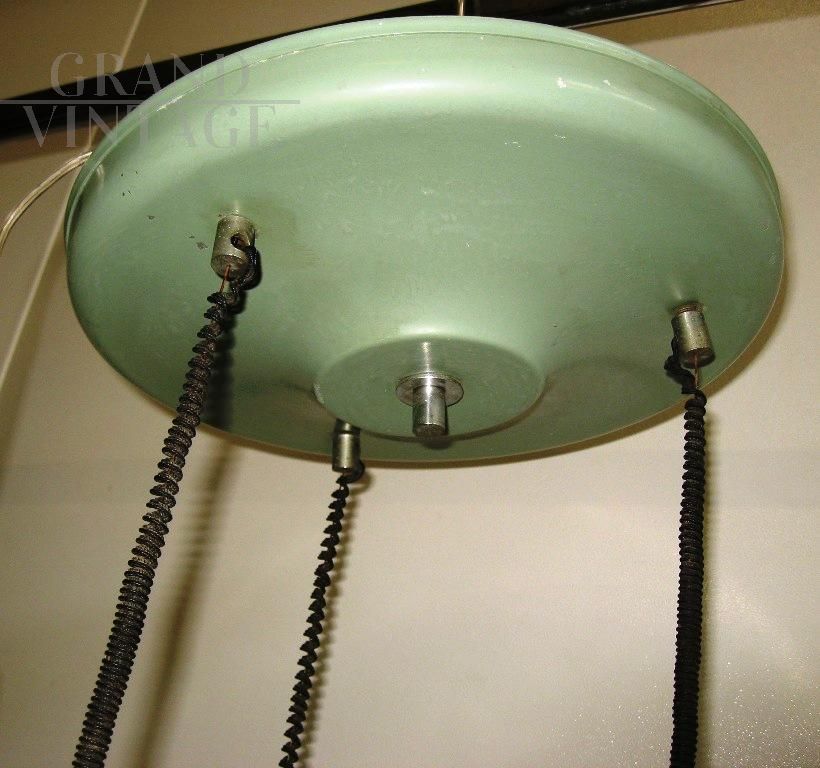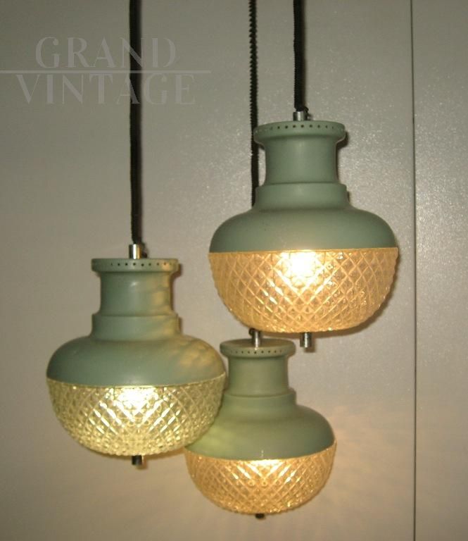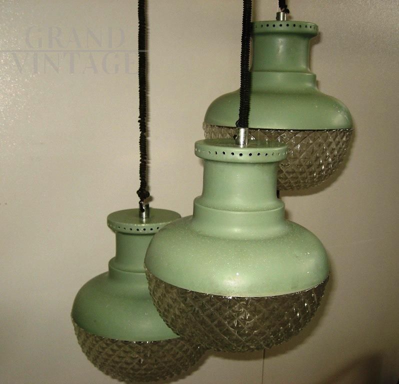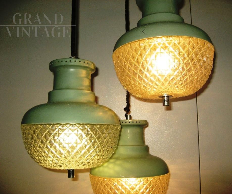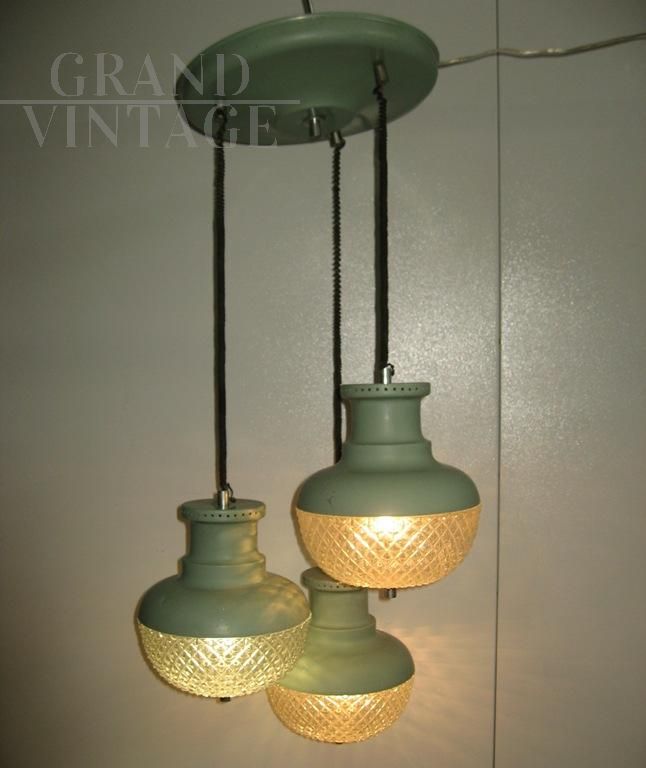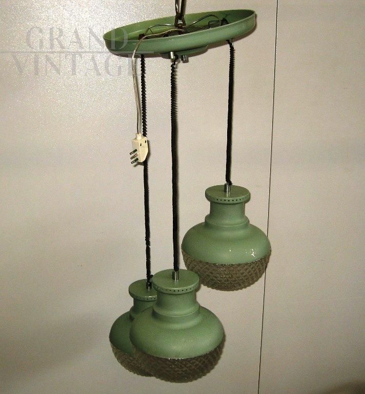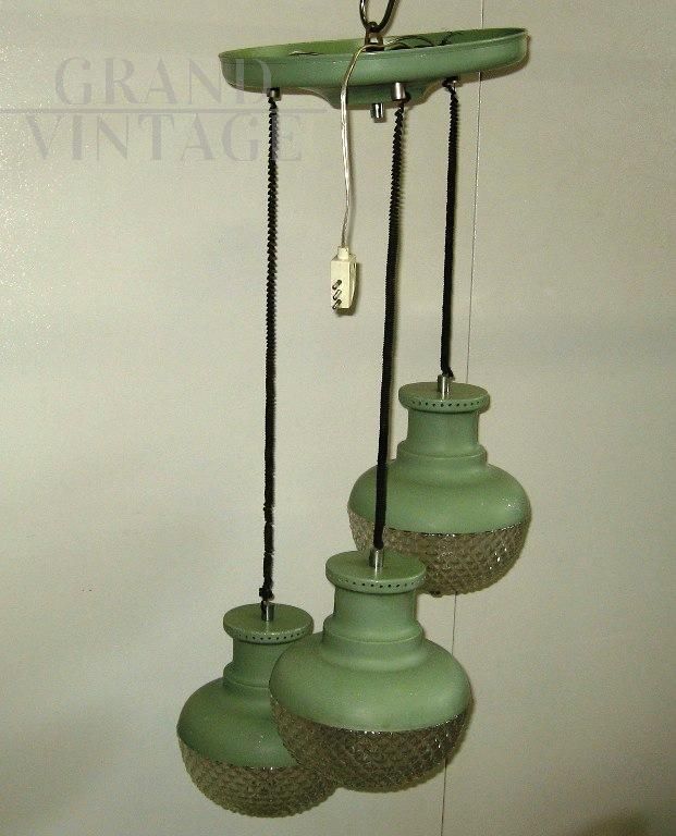 Modernariato italiano Vintage, modello a sospensione, tre luci che scendono a diverse altezze con struttura in metallo verniciato verde e con plafoniere in vetro avvitate.