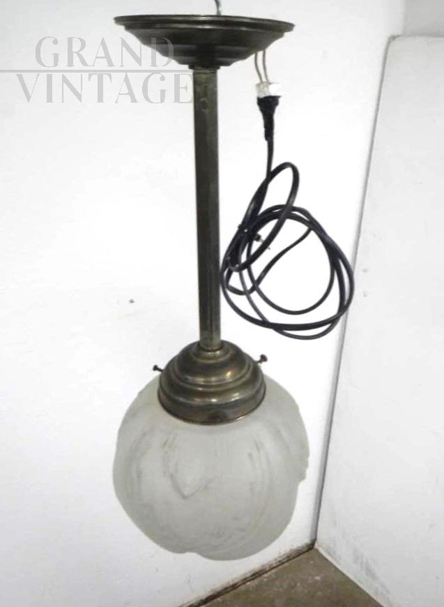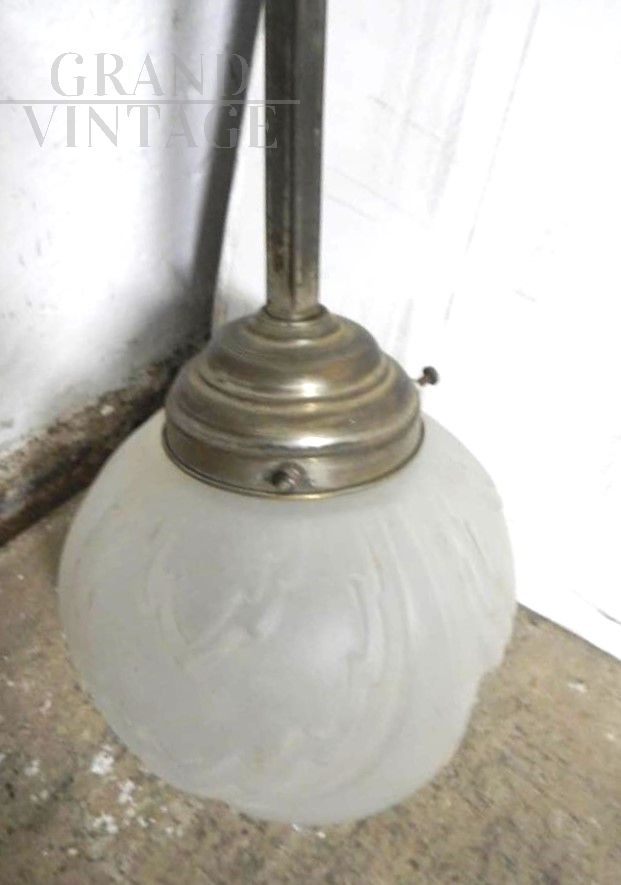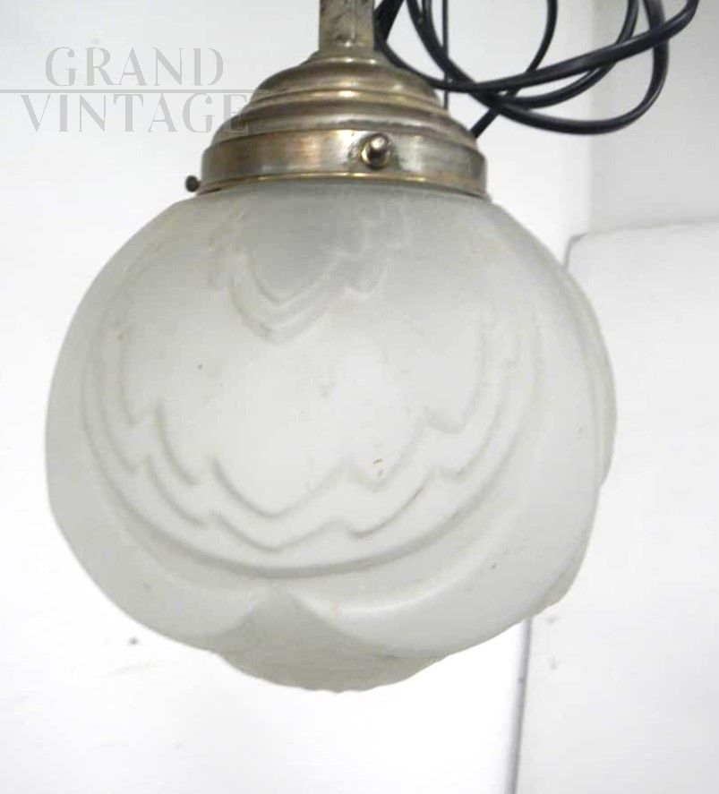 Lampada a sospensione art nouveau anni '20 in vetro opalino con decorazione a bocciolo e struttura in alluminio, funzionante, in buone condizioni con attacco per lampadina E14.