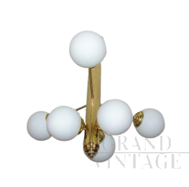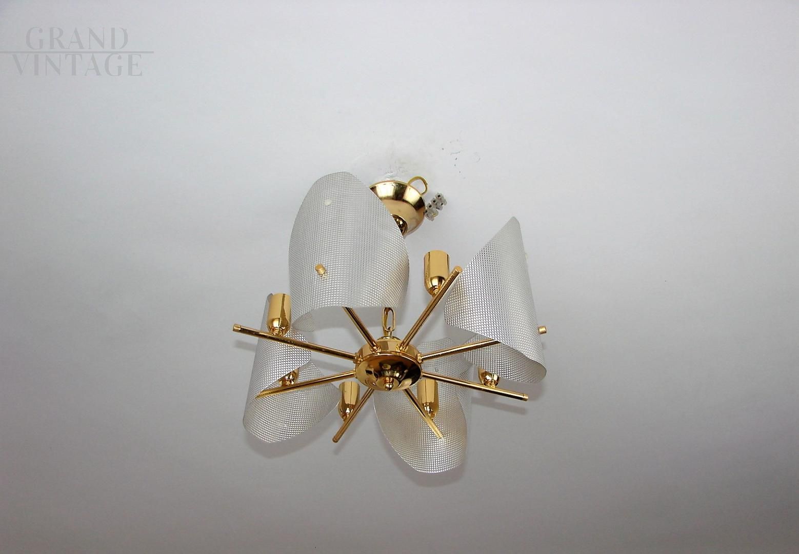 Lampadario anni '70 con paralumi in alluminio e struttura in acciaio ottonato. Il lampadario è in ottime condizioni, l'impianto elettrico è stato sostituito. Il lampadario richiede 8 lampadine E14.
