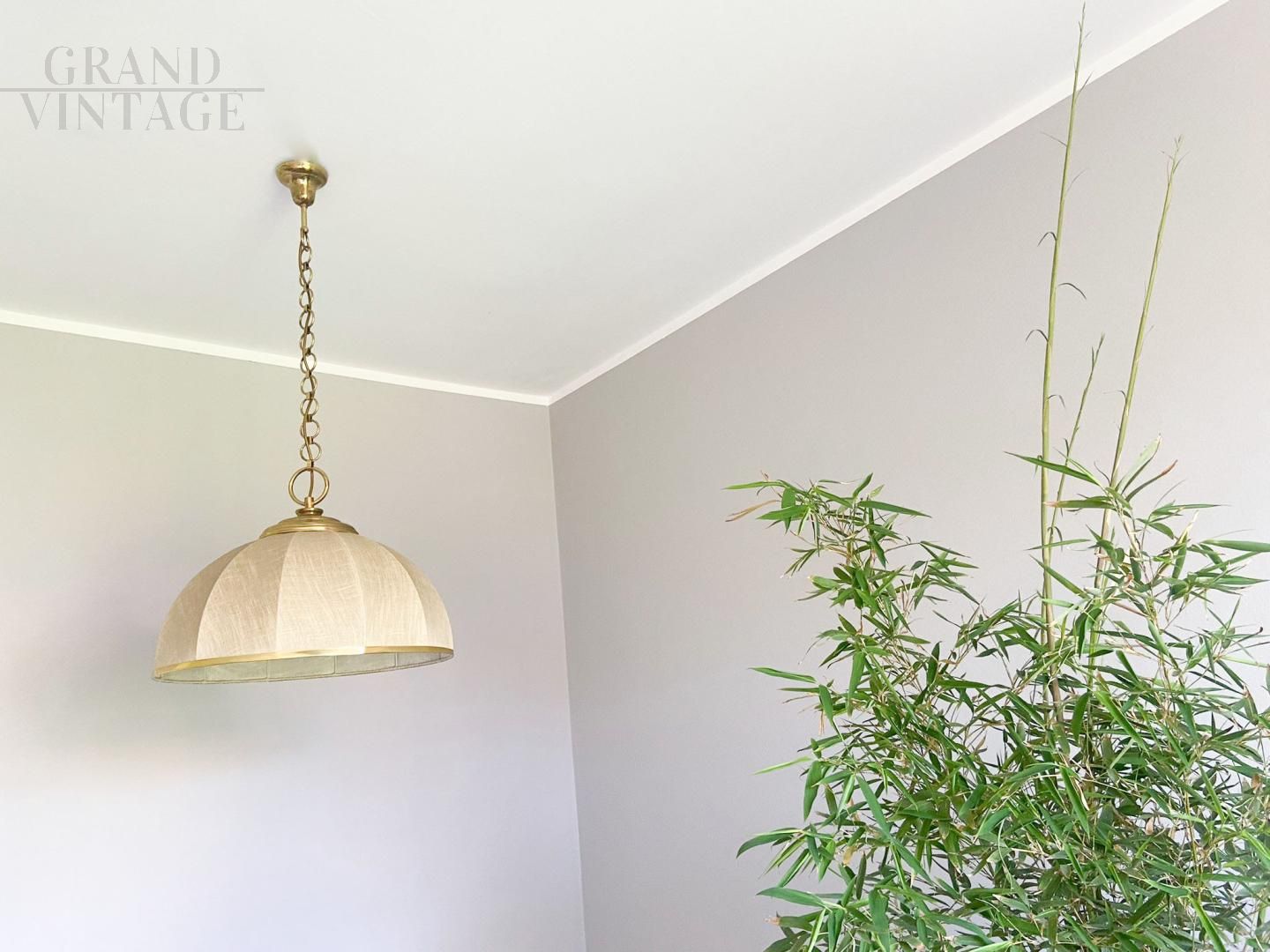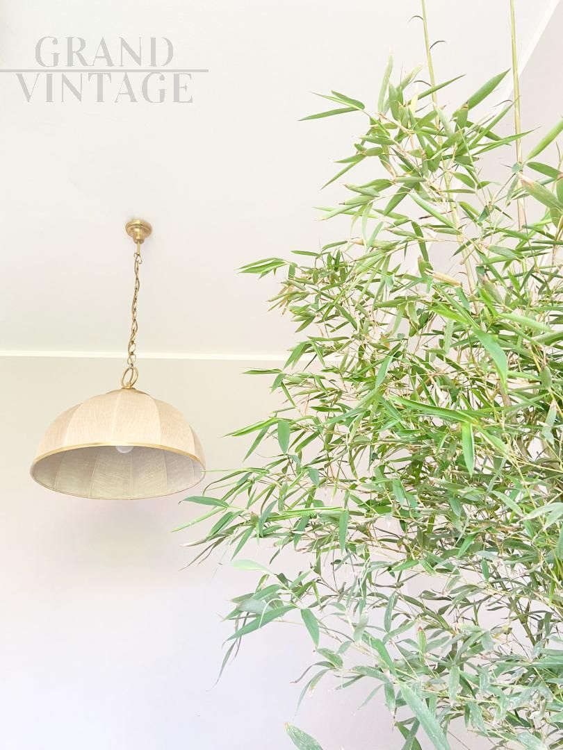 Lampadario vintage anni '70 in stile coloniale, in tela e ottone, di produzione italiana, in ottime condizioni di conservazione e completamente funzionante.