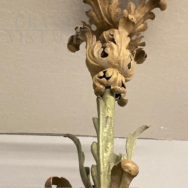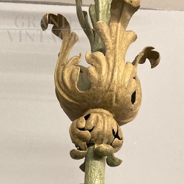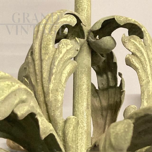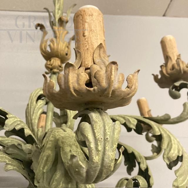 Bellissimo lampadario antico in ferro battuto con trionfo di foglie, laccato in colore verde sulla struttura, con 8 punti luce a candela color crema, Italia fine '800. Di grandissima raffinatezza la lavorazione delle foglie. Non presenta elettrificazione, su richiesta possibilità di aggiungere lìimpianto .