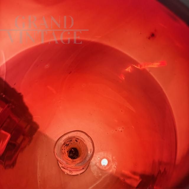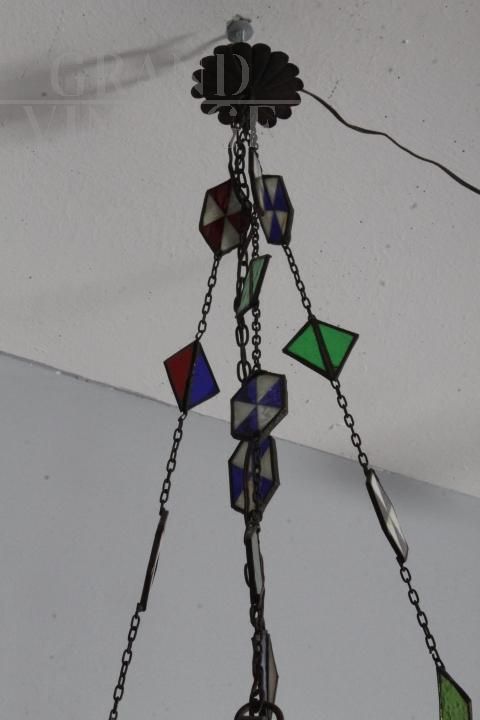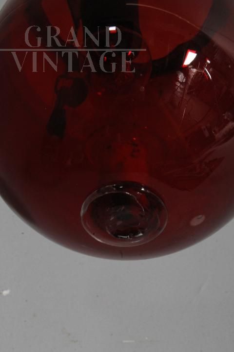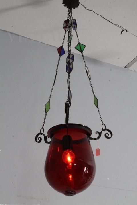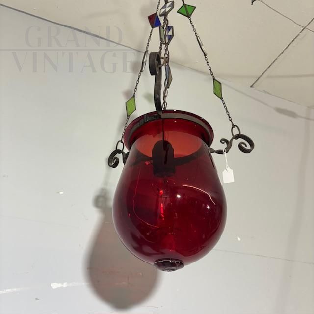 Lampadario antico in vetro rosso con inserti di vetro a piombo, fine '800