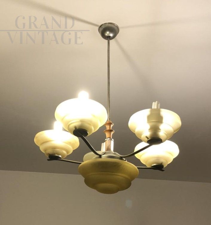 Lampadario art déco degli anni '30 con 5 luci più un globo centrale, l'asta è rivestita in legno di noce. In perfette condizioni estetiche ed elettriche.