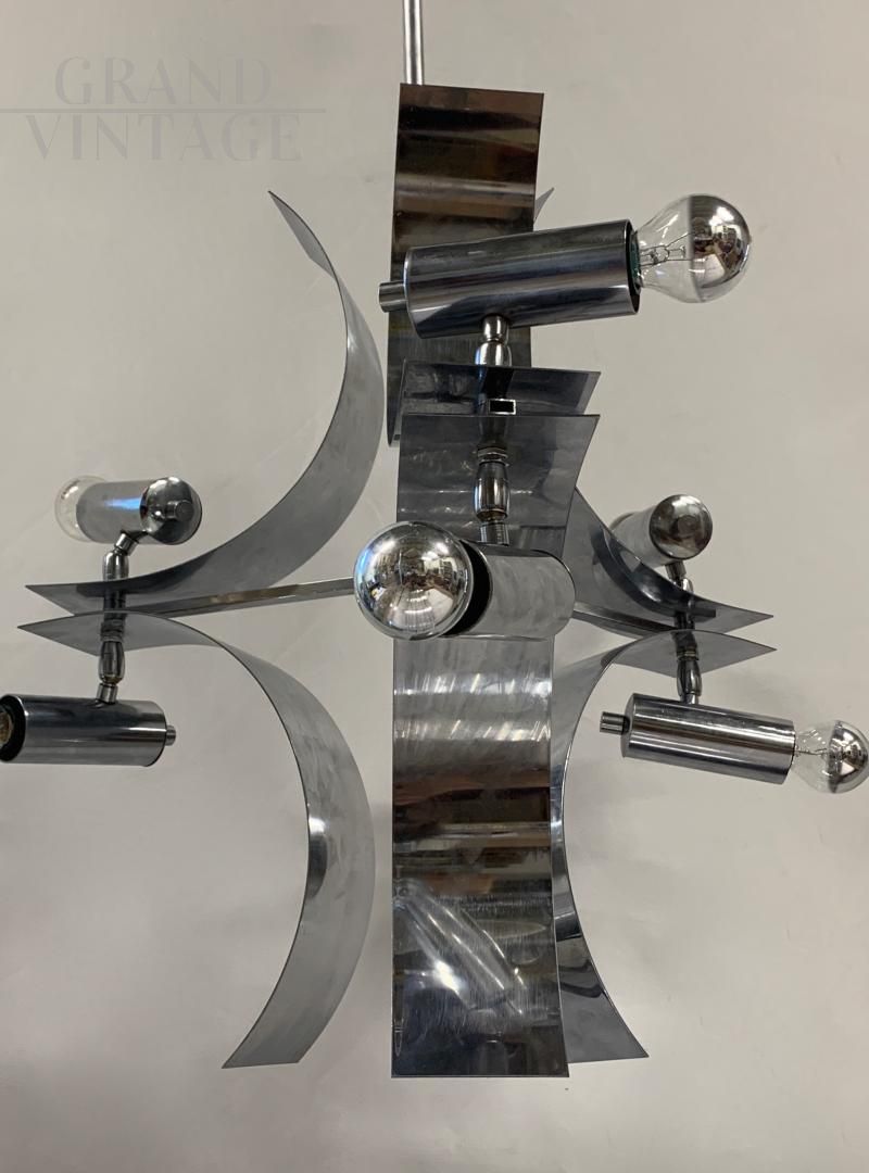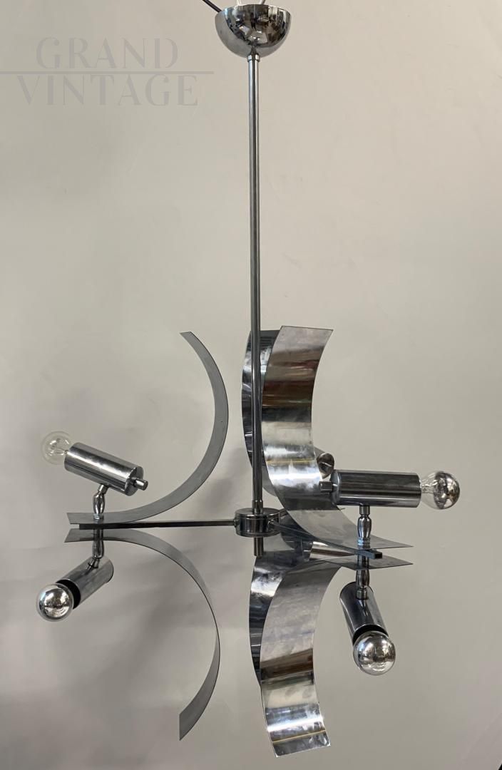 Fantastico e raro lampadario degli anni '70 attribuito alla ditta Reggiani, molto particolare con il suo stile space age, costituito da una struttura in ferro cromato e da diversi punti luce a faretto direzionabili. in buone condizioni, ha qualche naturale segno del tempo sulla cromatura. Il lampadario ha un impianto elettrico rifatto a nuovo, ed è funzionante con lampadine di tipo E14, si consiglia l'utilizzo di lampadine al Led con cromatura superficiale. Ottimo elemento che può illuminare ogni stanza: dalla cucina alla sala, dall'entrata alla camera o il bagno.