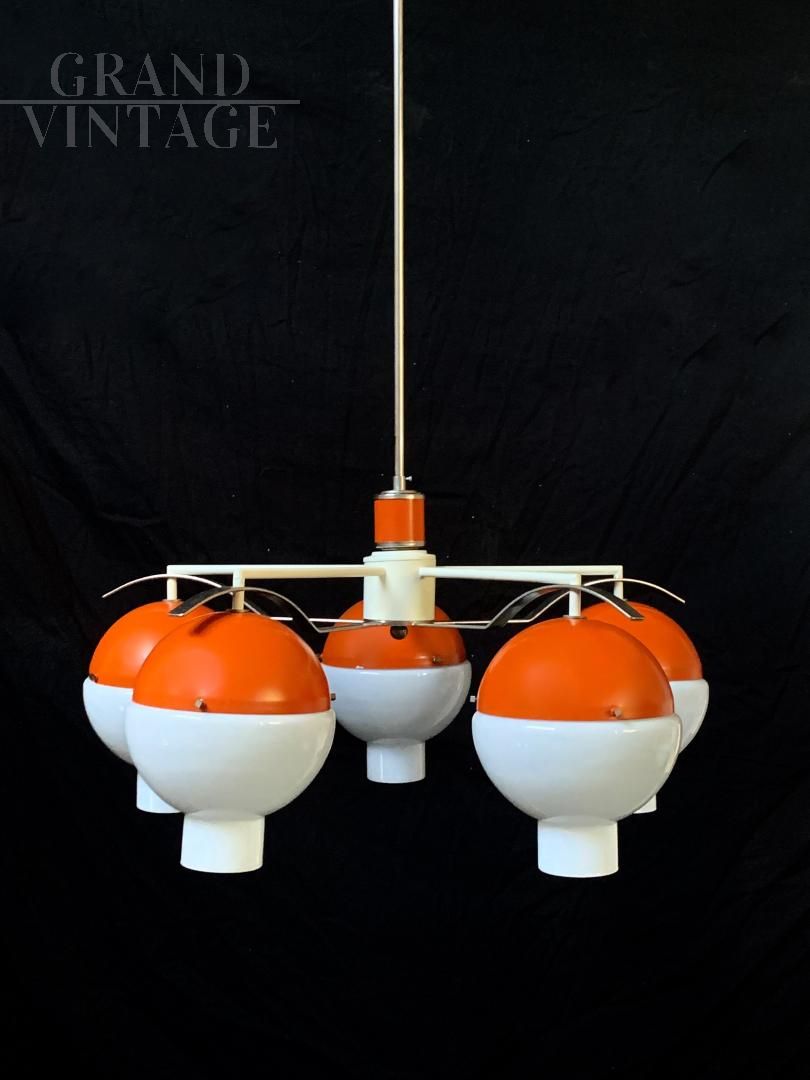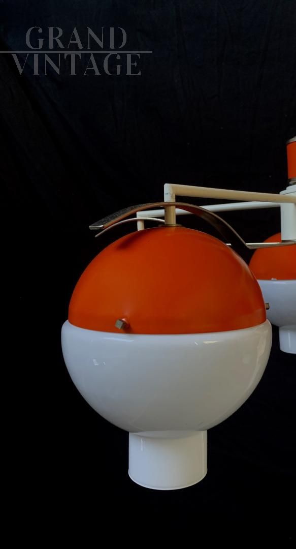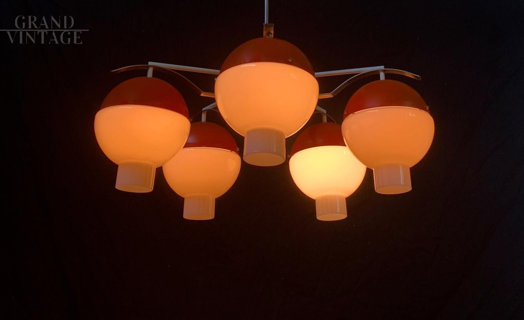 Fantastico lampadario stile Stilnovo degli anni 1960 circa, tutto originale e con impianto elettrico rifatto. Attribuito alla ditta Stilnovo, i vetri non sono crepati, sono montati sulla struttura in ferro grazie a delle viti, e sono smontabili per la spedizione.