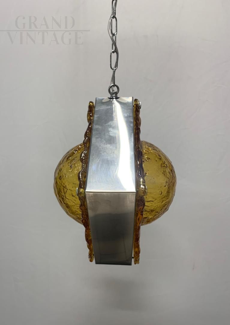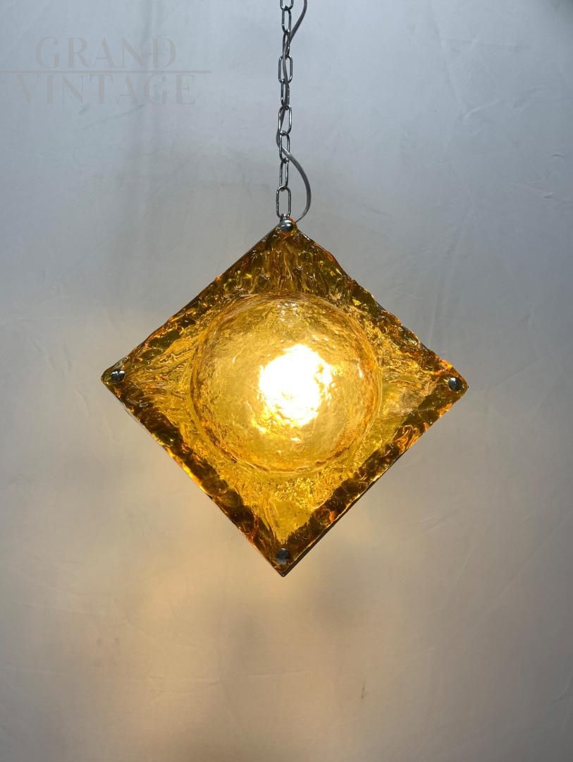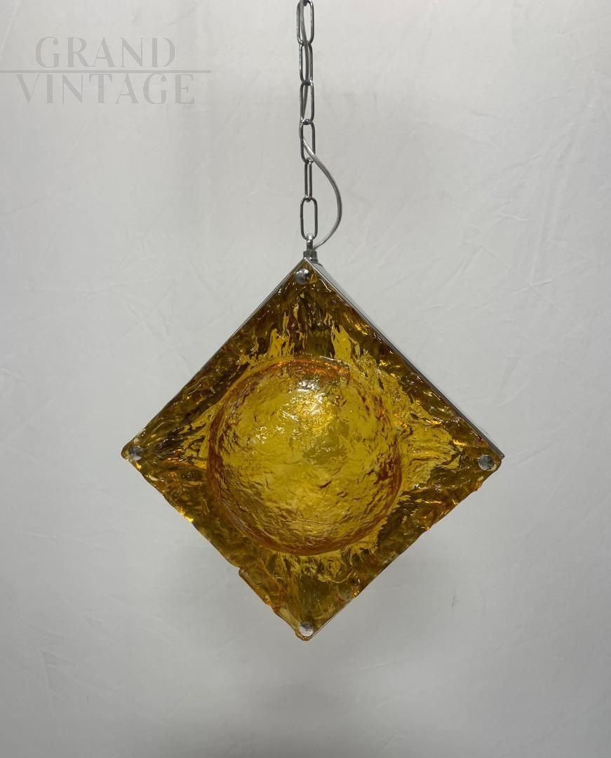Fantastico e particolare lampadario attribuito alla ditta Mazzega anni '70 con doppia piastra in vetro di Murano color arancione ambra su struttura metallica a rombo. Le piastre di Murano sono lavorate a mano su stampo e si possono rimuovere dal lampadario tramite le 4 viti in evidenza. Il lampadario ha un attacco per lampadina di tipo E27. I vetro verranno smontati per una spedizione più sicura, la catena si può accorciare secondo le esigenze.