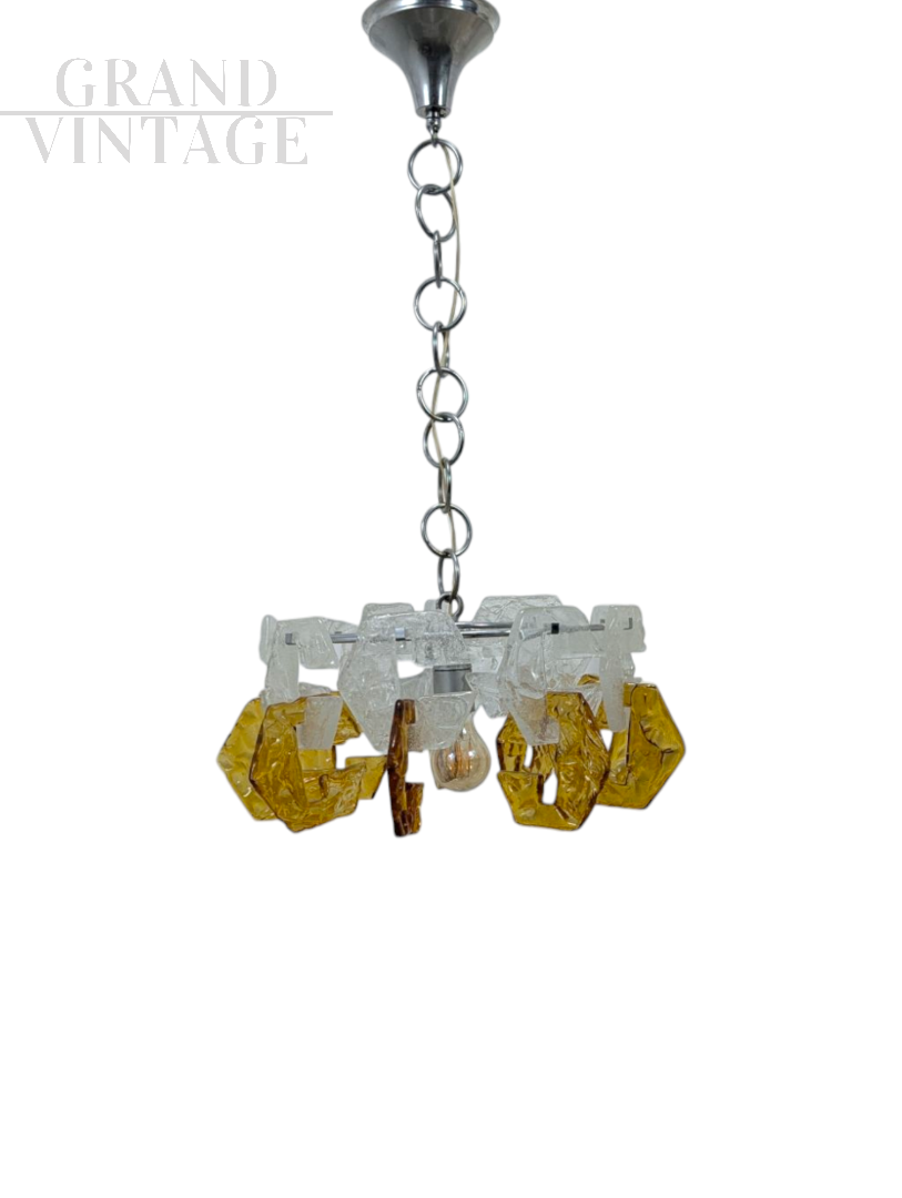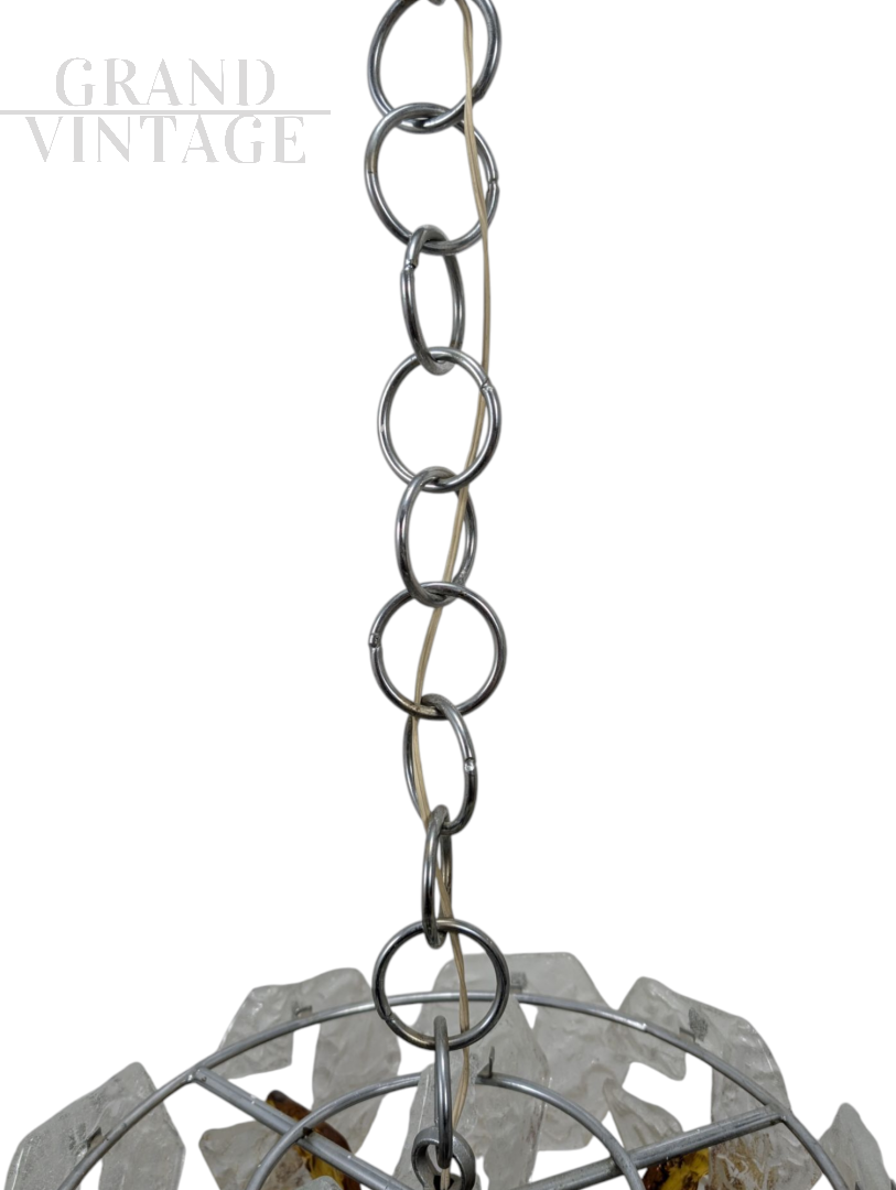 Lampadario a sospensione vintage con steli in vetro di Murano nei colori trasparente e ambra con bollicine in sospensione, dal particolare motivo geometrico, Italia anni '70. In ottime condizioni generali, elettronicamente testato e funzionante. Va montata una lampadina con attacco E27.