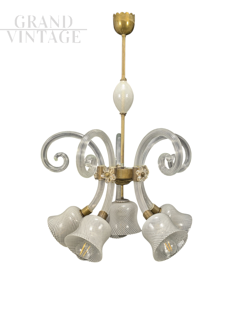 Lampadario a 5 luci in stile Barovier e Toso anni '40, in ottime condizioni, reparto elettrico funzionante e testato. Dimensioni 95 x 60 cm (altezza, diametro)