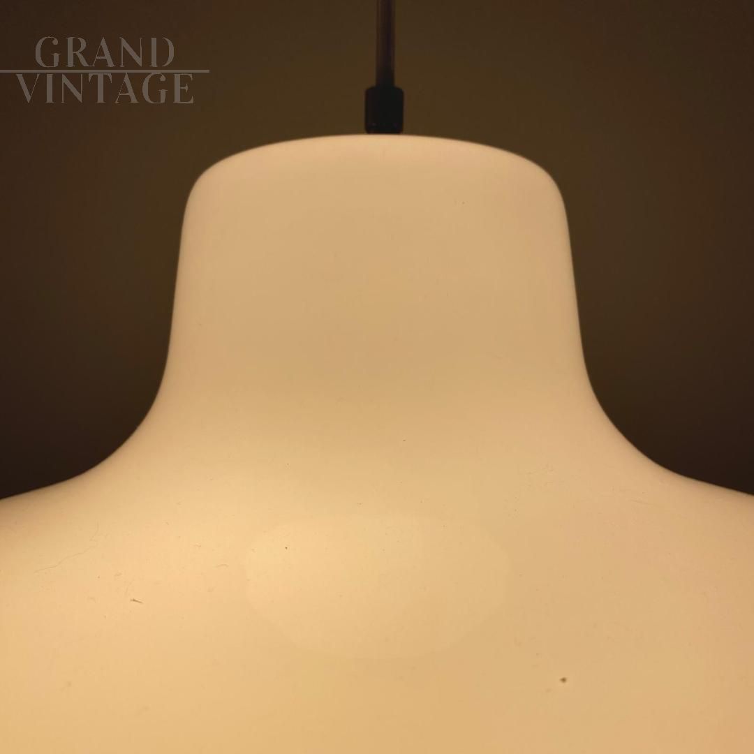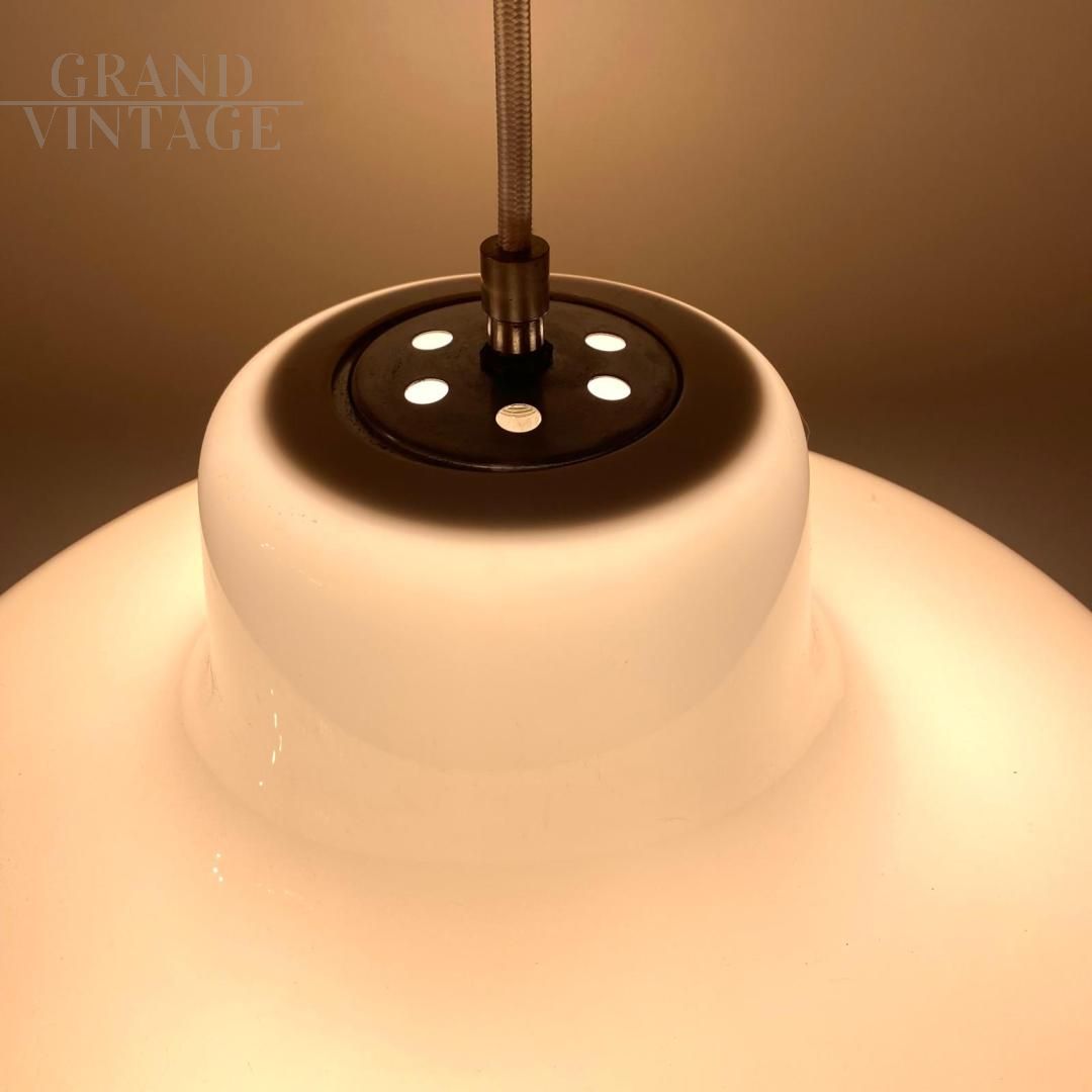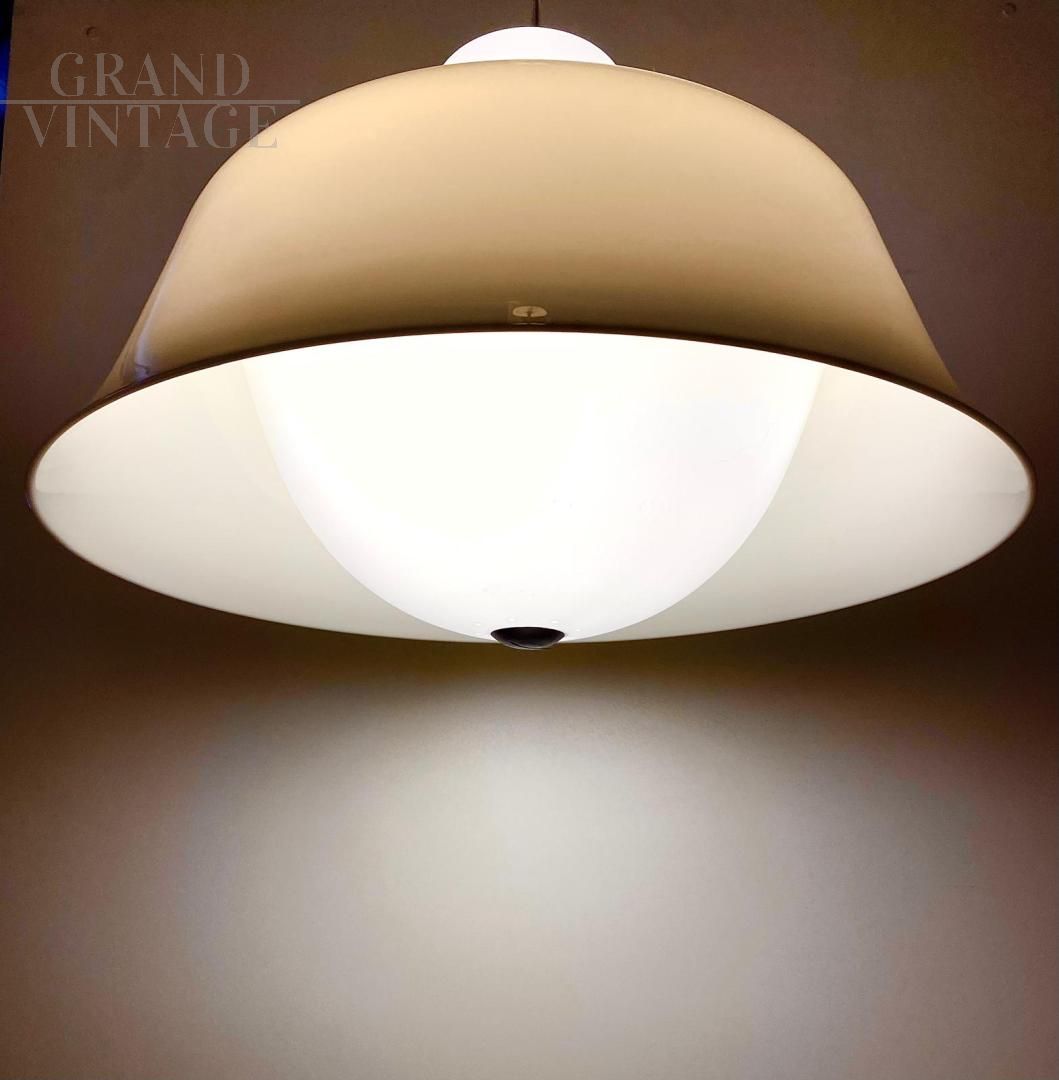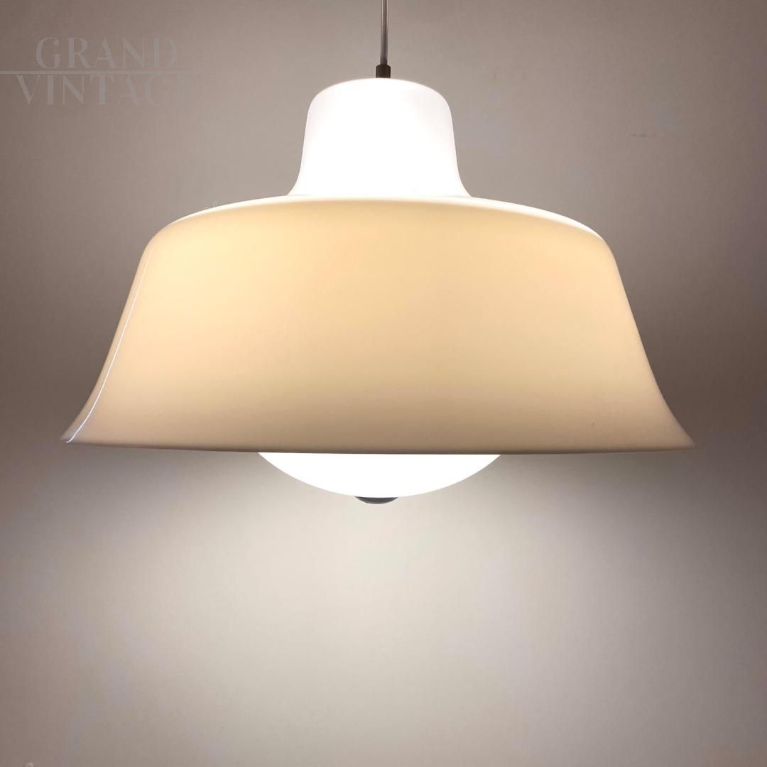 Lampadario design di Sergio Asti per Kartell, Italia '60 (prova di autenticità nella gallery). Progettata dall'acclamato designer italiano Sergio Asti e prodotta da Kartell negli anni '60, questa elegante lampada da soffitto è una perfetta rappresentazione del design moderno di metà secolo. Caratterizzata da un elegante paralume a campana realizzato in acrilico bianco, la lampada è impreziosita da raffinati dettagli in ottone che aggiungono un tocco di raffinatezza alla sua forma minimalista. Dotata di un singolo attacco per lampadina E27, questa lampada a sospensione è stata accuratamente ricablata, garantendo una perfetta integrazione negli interni contemporanei. Questo pezzo senza tempo incarna lo spirito innovativo In eccellenti condizioni con qualche segno del tempo.