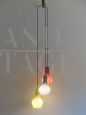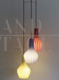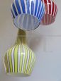 Lampadario disegnato da Flavio Poli per Seguso Vetri D’arte, diffusori in vetro colorati a righe, incamiciato bianco, anni 50. Vetri perfetti, presentato alla 29a biennale di Venezia. Misura singolo diffusore: altezza 29 cm - diametro 18 cm.