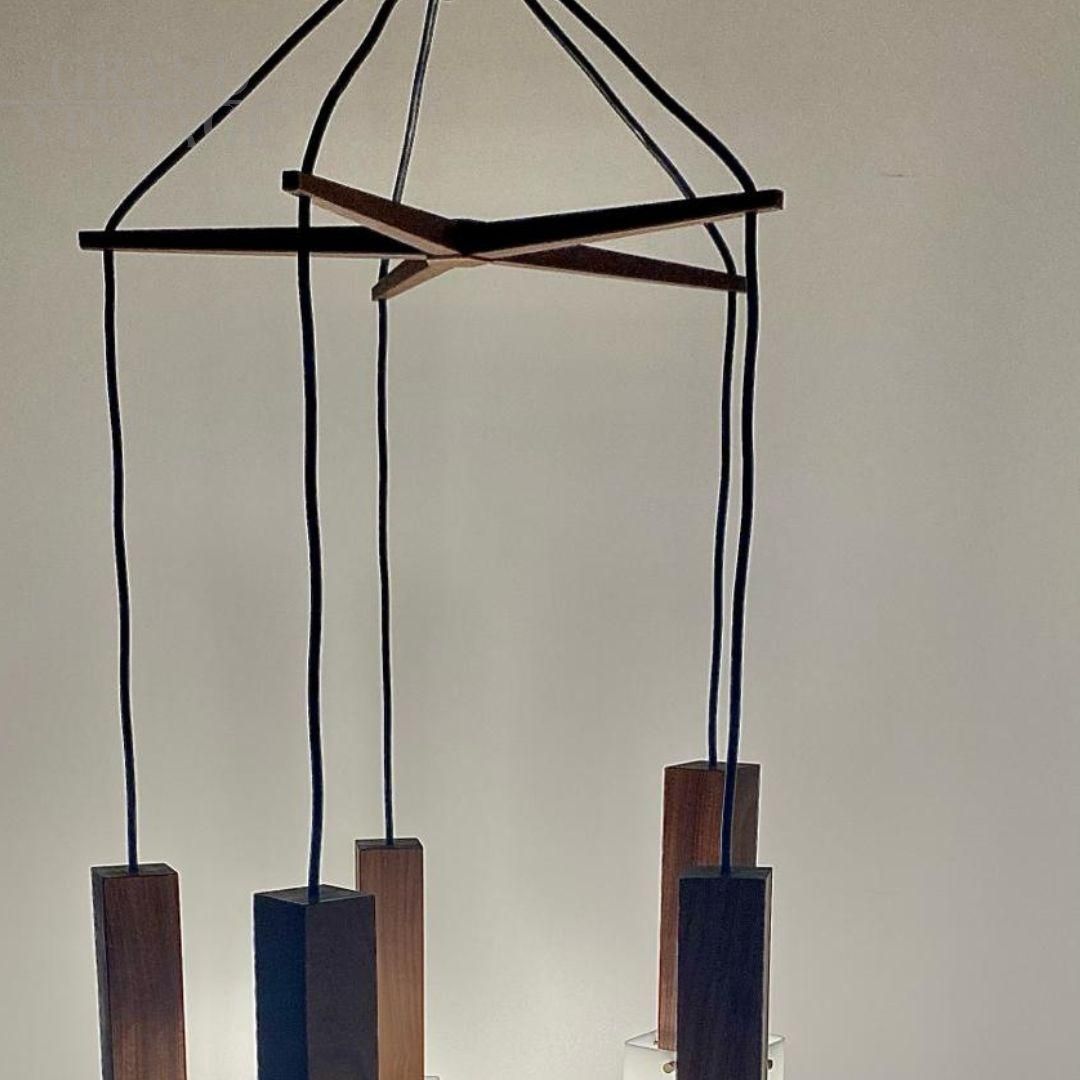 Lampadario design Guzzini a 5 luci in legno di palissandro, Italia anni '60
