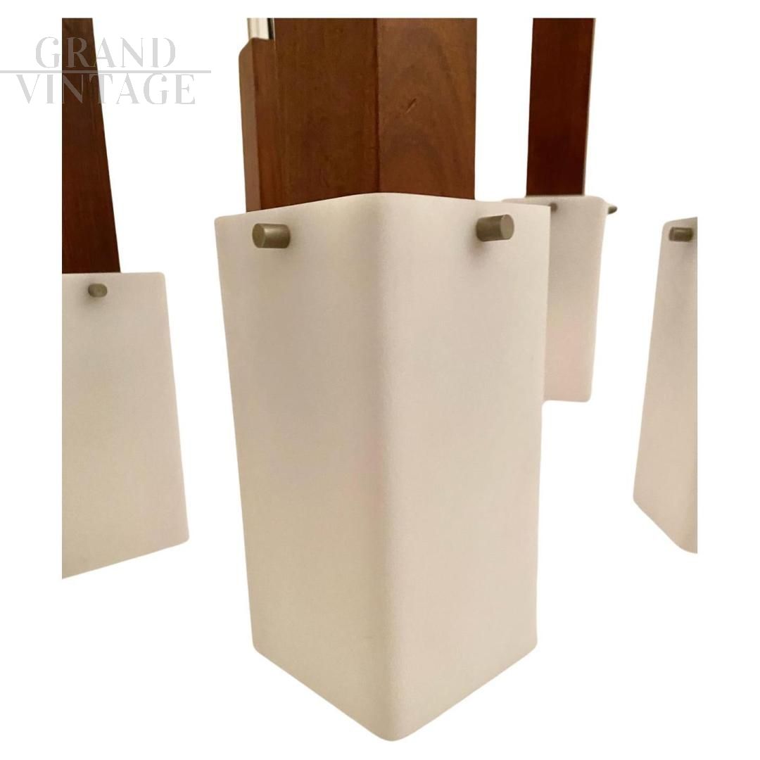 Rara lampada a sospensione lampadario vintage a cinque luci prodotta da Guzzini Italia negli anni Sessanta, con struttura in legno massello di palissandro e paralumi in acrilico. Struttura e paralumi intatti, eleganti finiture del legno e dettagli dei paralumi. La struttura in legno è stata rifinita e riverniciata rispettando il colore scuro originale. Paralumi senza crepe o danni. Tutte le parti della lampada sono quelle originali. Ottime condizioni, revisionata dal nostro elettricista e perfettamente funzionante.
