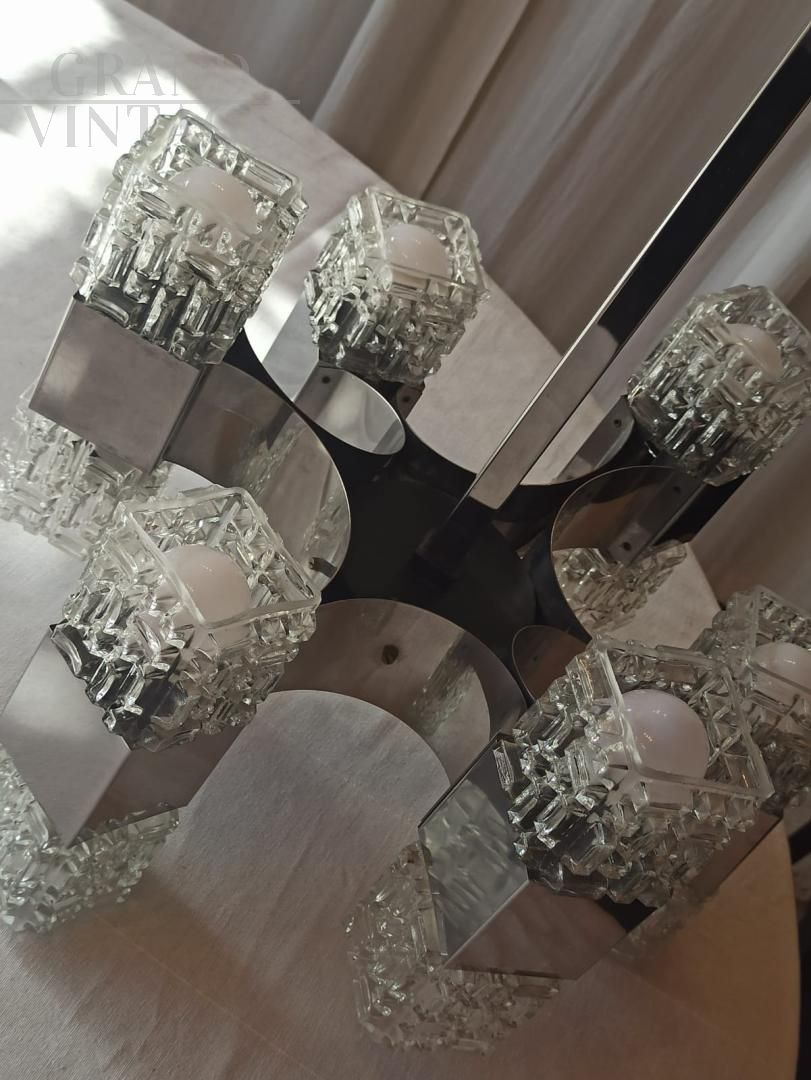 Lampadario di Gaetano Sciolari con struttura cromata e 12 luci con paralumi in vetro, Italia anni '60. L'oggetto è completamente funzionante, presenta i naturali segni del tempo. Il designer e imprenditore italiano Angelo Gaetano Sciolari è di recente tornato sotto i riflettori internazionali a causa dell'interesse di una nuova generazione di ammiratori per il design delle sue creazioni.