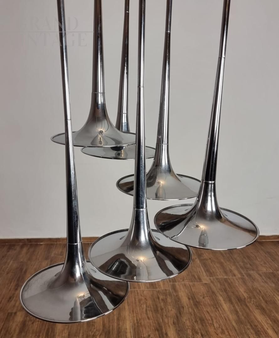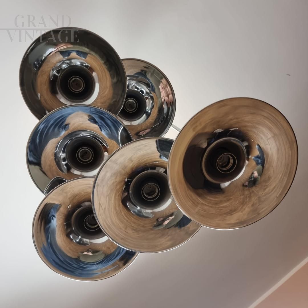 Lampadario di Goffredo Reggiani anni '70, raro modello con 6 trombe in acciaio cromato, ciascuna è un punto luce. Il lampadario è in ottime condizioni.