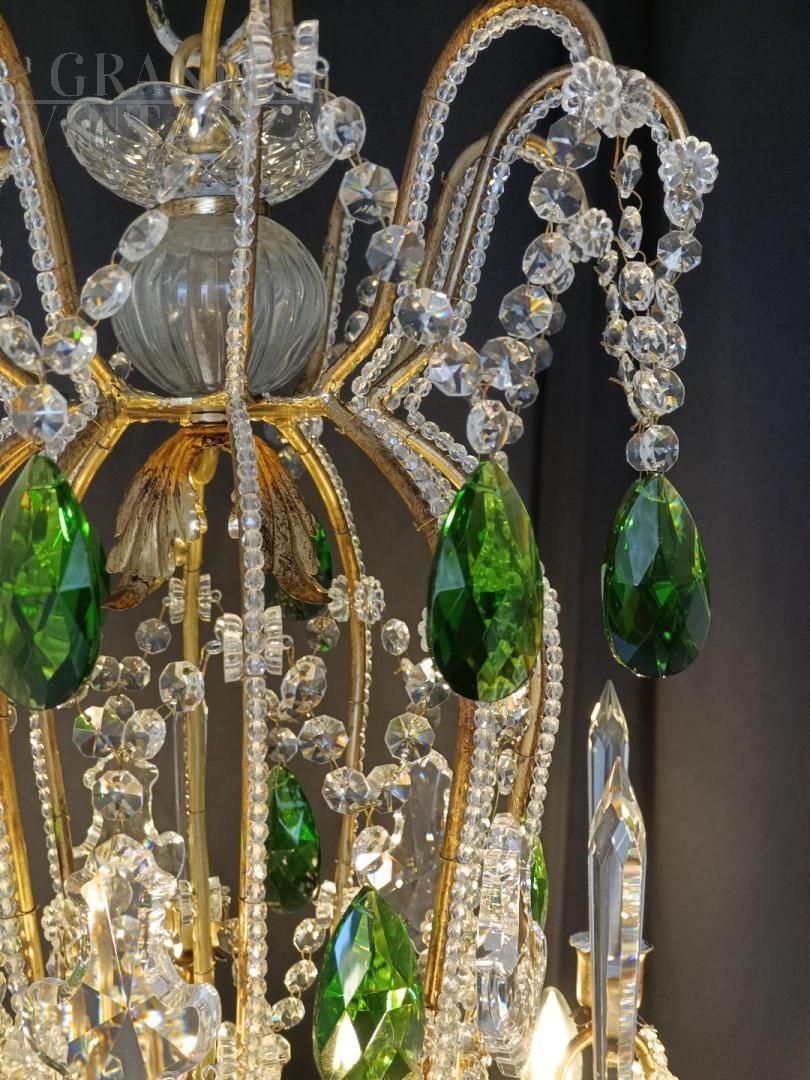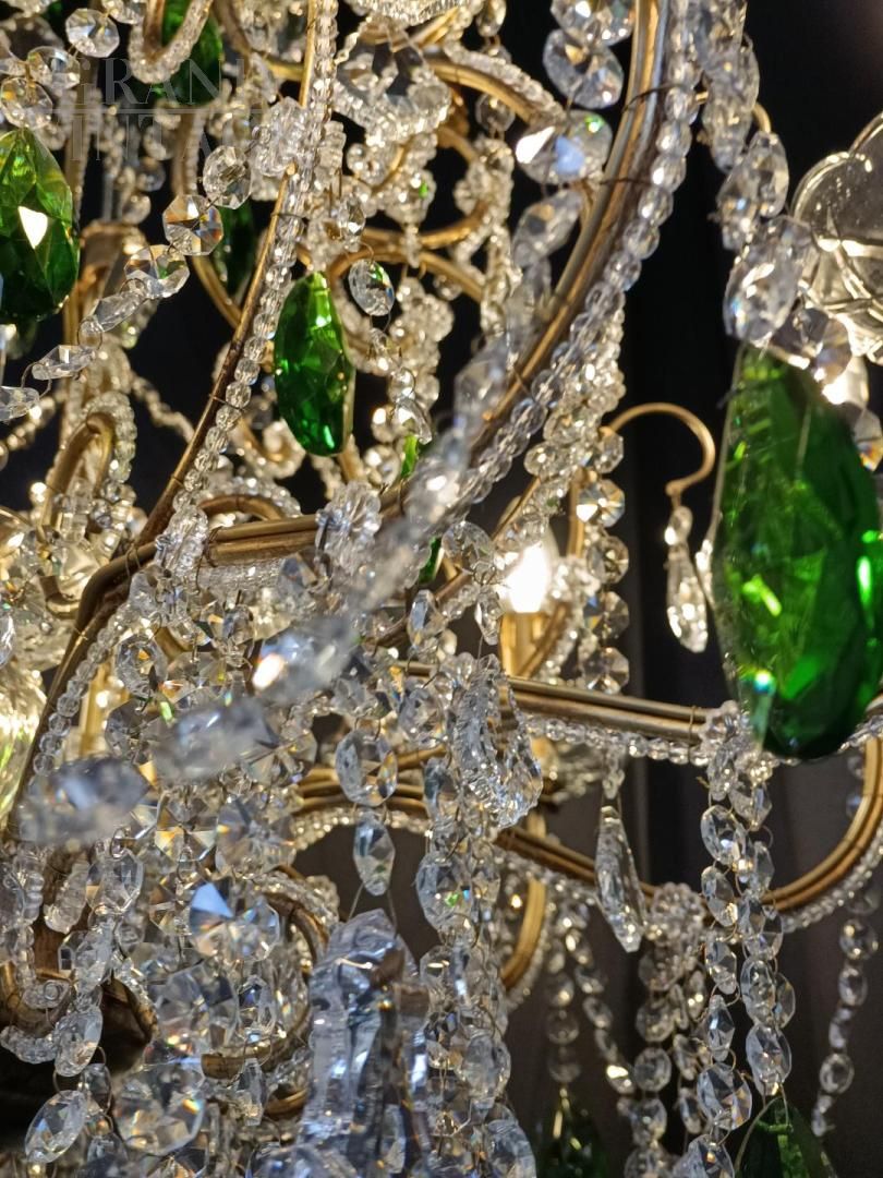 Lampadario finemente rifinito a mano, il telaio è in ferro con finitura in oro antico, i pendagli sono in cristallo trasparente e verde, legature dei cristalli fatte a mano con filo di ottone. I pezzi in cristallo verde possono essere sostituiti con cristalli trasparenti. Il lampadario ha 10 punti luce con porta lampadine dorati a forma di candela.
