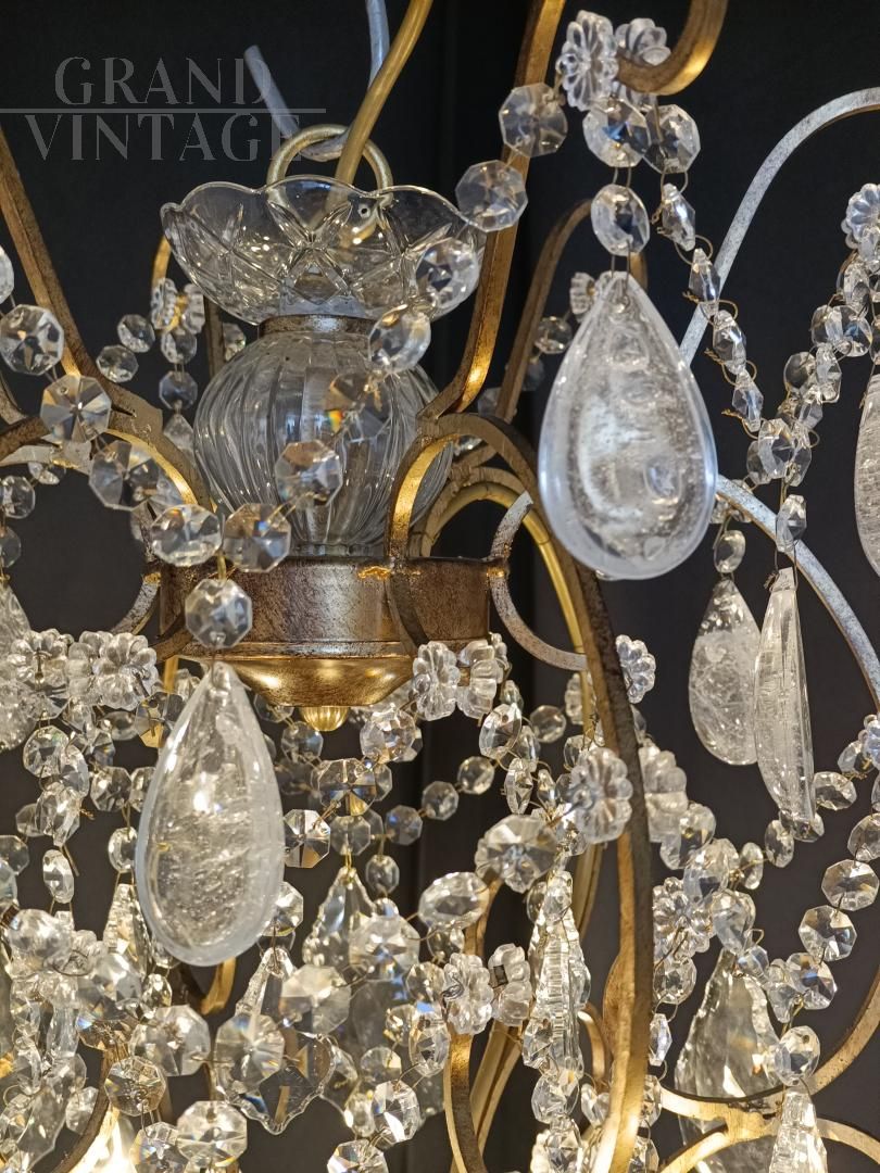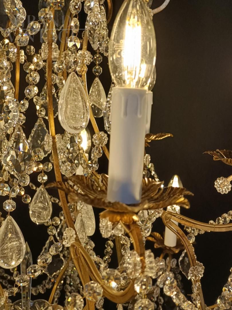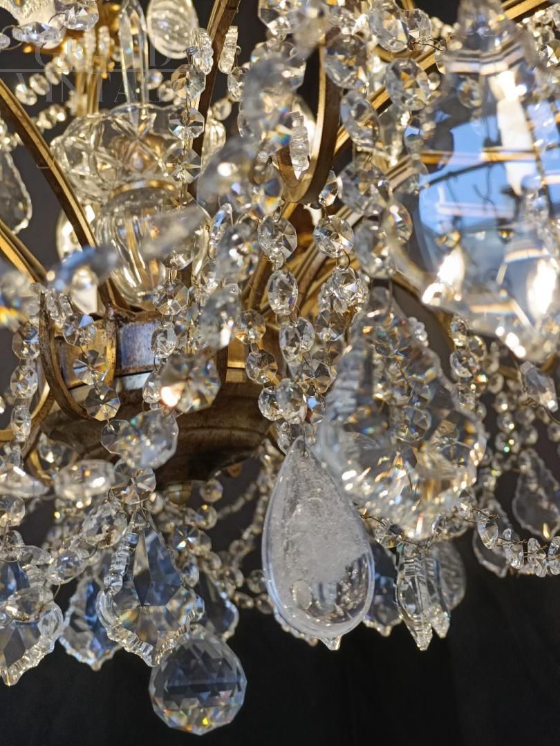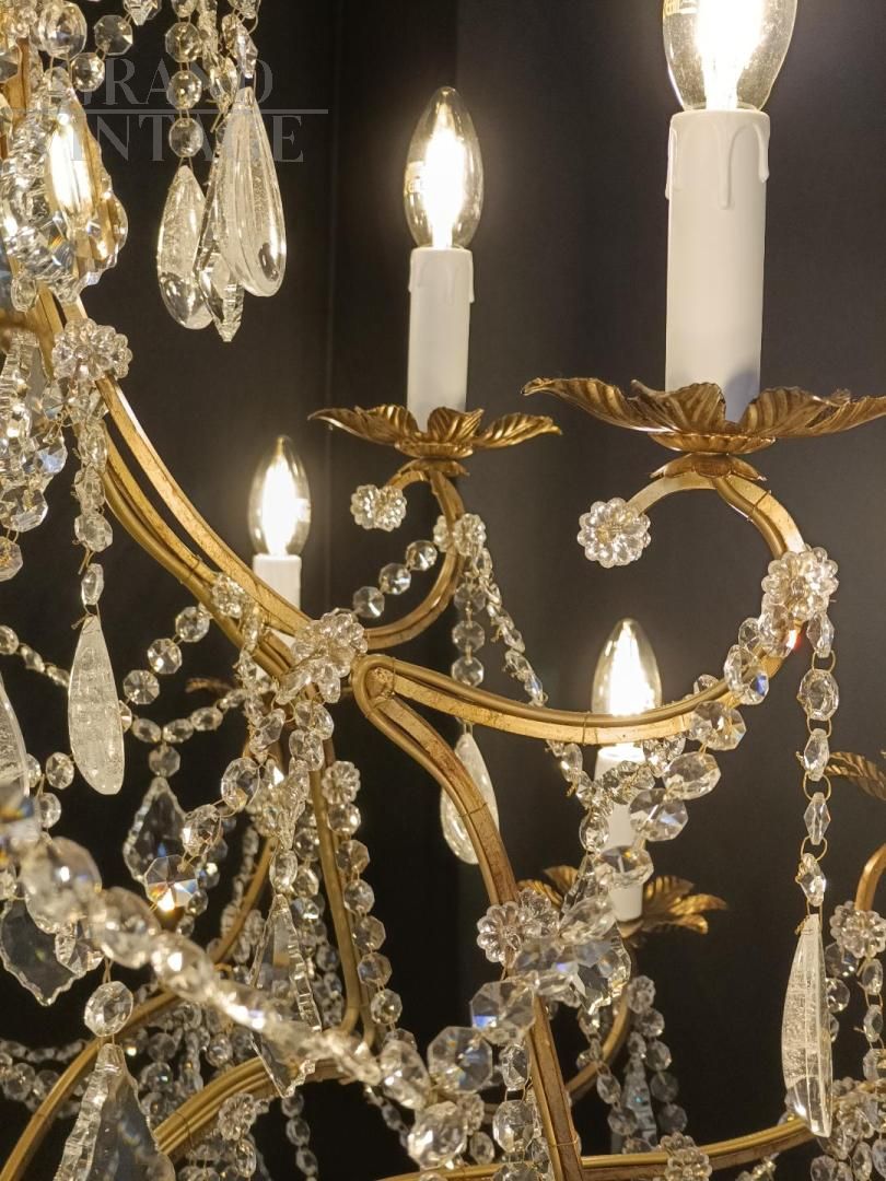 Lampadario in stile fiorentino in cristallo a 18 luci, pronto per essere installato, finemente rifinito, lavorato a mano con legature dei cristalli realizzate a mano con filo di ottone. Finutura oro antico.