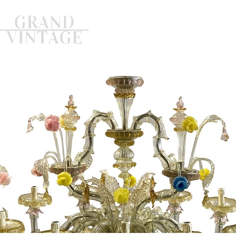 Grande e sontuoso lampadario in vetro di Murano artistico nello stile di Rezzonico, un bellissimo modello a barca con elementi in vetro di Murano soffiato e lavorato a mano con tecnica antica. Su ogni braccio in metallo cromato sono infilati, pezzo per pezzo, i vetri detti “bossole” realizzati a “rigadin” (striature longitudinali o spiroidali) che compongono il lampadario. Questo modello è caratterizzato da pregiate decorazioni in Cristallo Oro e impreziosito con raffinati dettagli di foglie, coppe e riccioli dorati e fiori multicolore. Il lampadario è composto da 12 punti luce che supportano lampdine di tipo E14, ed è compatibile con lampadine a led.