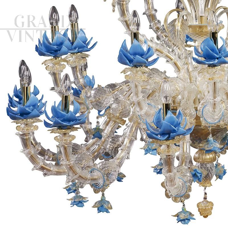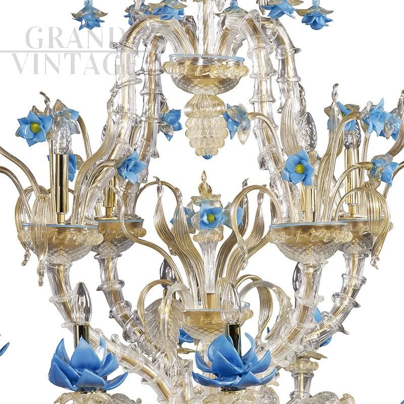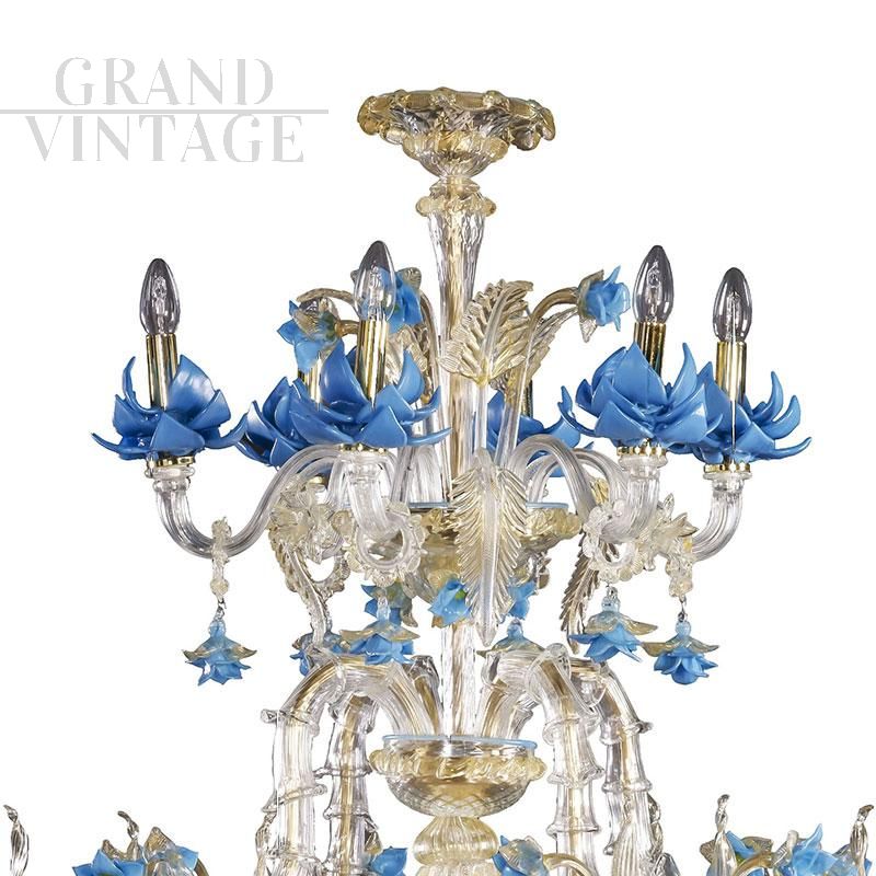 Lampadario in stile Rezzonico in vetro di Murano con fiori azzurri