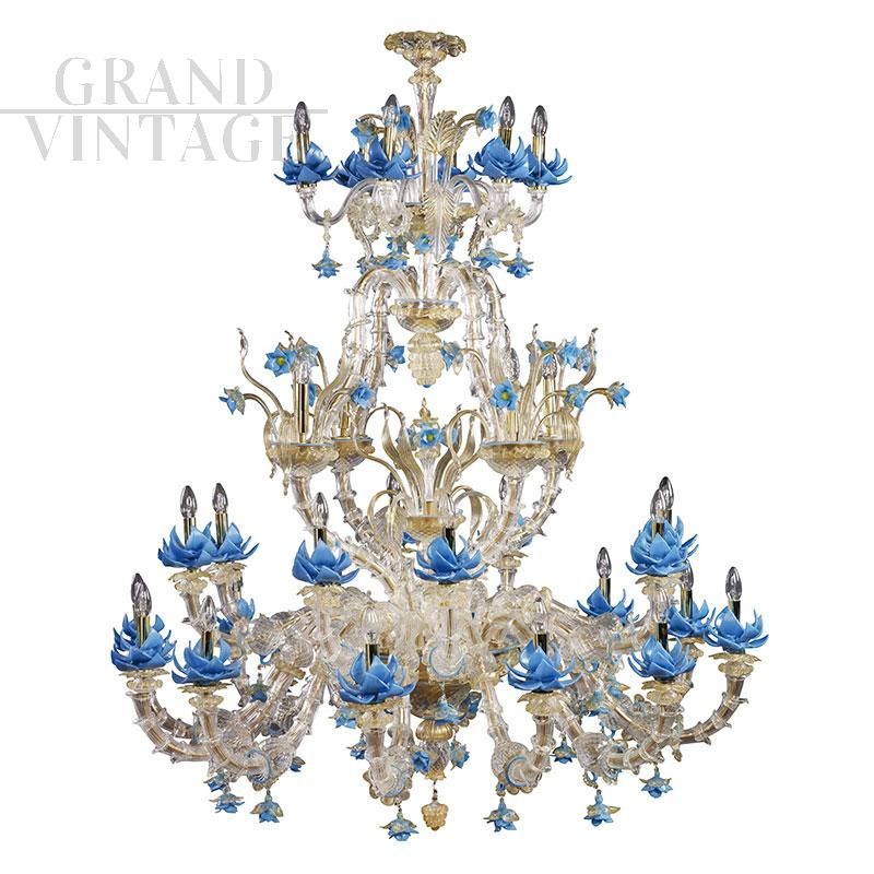 Lampadario in vetro di Murano trasparente, bianco e oro, forgiato con lavorazione antica a merletto e dettagli in oro con bellissimi fiori azzurri. Sistema con 30 luci organizzate su tre ordini.