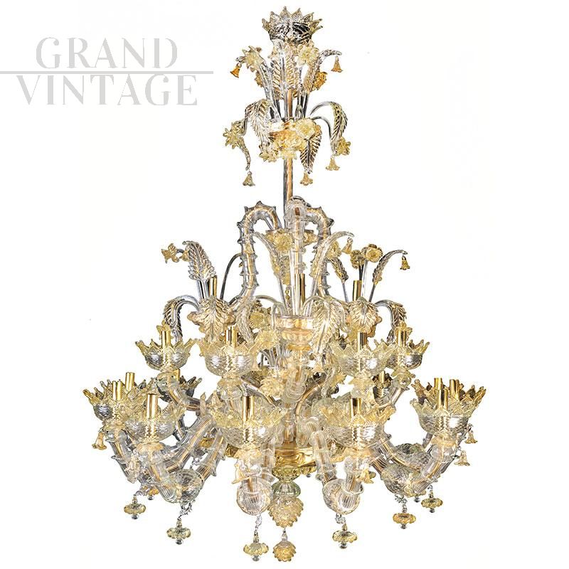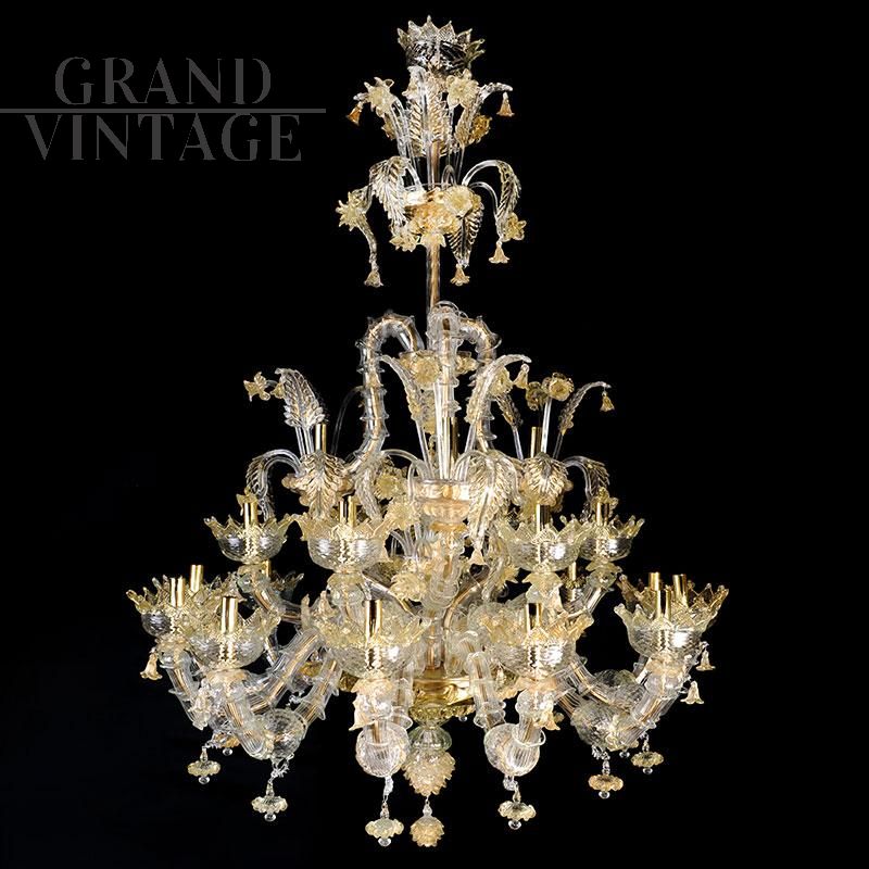 Lampadario in vetro di Murano, stile Rezzonico, della prima metà del XX secolo (anni '30-'40), soffiato e lavorato a mano con tecnica antica. Su ogni braccio in metallo dorato sono infilati, pezzo per pezzo, i vetri detti “bossole” realizzati a “rigadin” (striature longitudinali o spiroidali) che compongono il lampadario. Si distingue per la pregiata decorazione in Cristallo Oro e i preziosi dettagli di fiori e foglie rifiniti a mano dai maestri vetrai Muranesi. Il lampadario in oggetto, completamente restaurato e ricablato, presenta un sistema composto di 21 luci organizzate su tre ordini (12 inferiori, 6 centrali e 3 superiori) idonee a contenere lampadine con attacco E14 (non incluse).