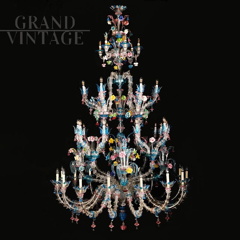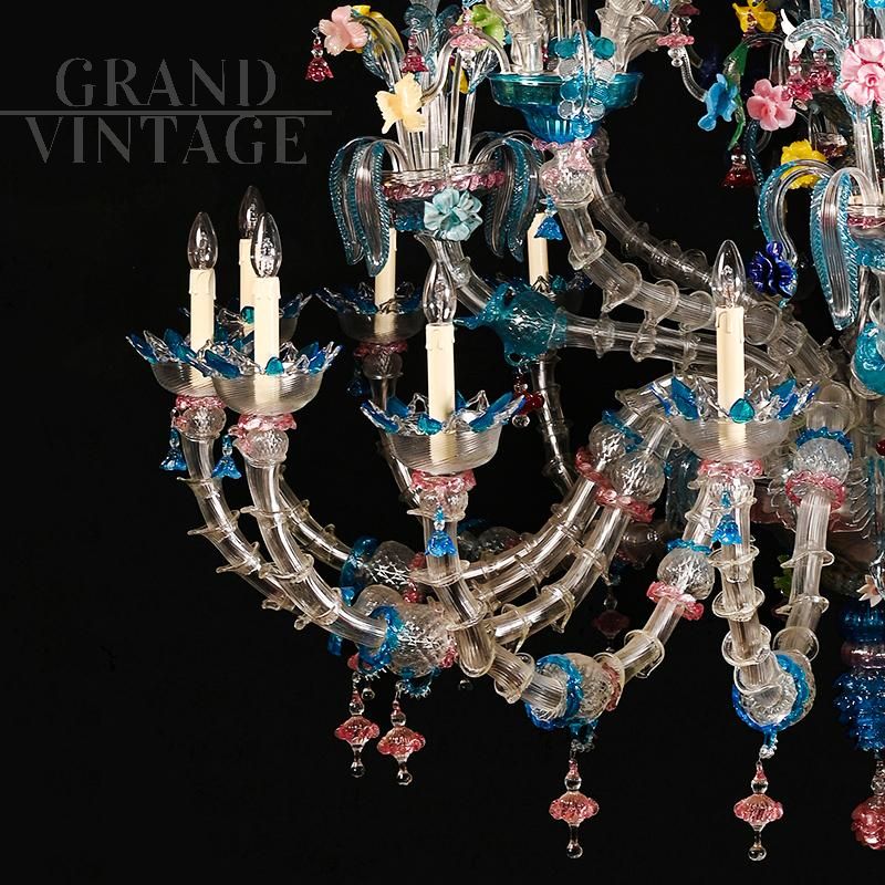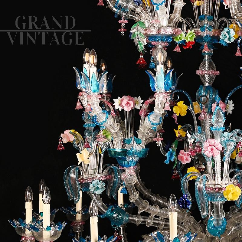 Grande e sontuoso lampadario in vetro di Murano artistico nello stile di Rezzonico della prima metà del XX secolo (anni ’30-’40) con elementi in vetro di Murano soffiato e lavorato a mano con tecnica antica. Si distingue per la pregiata decorazione in Cristallo multicolore e i preziosi dettagli di fiori e foglie rifiniti a mano dai maestri vetrai Muranesi.