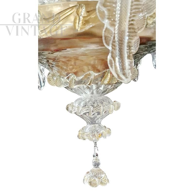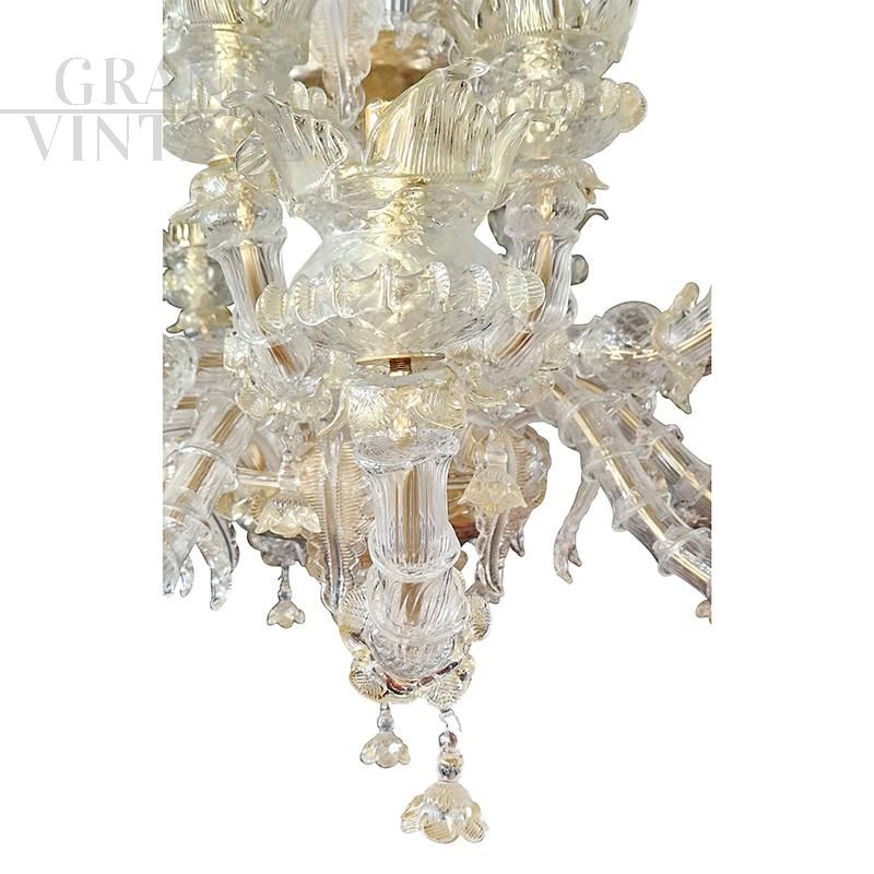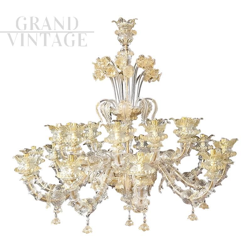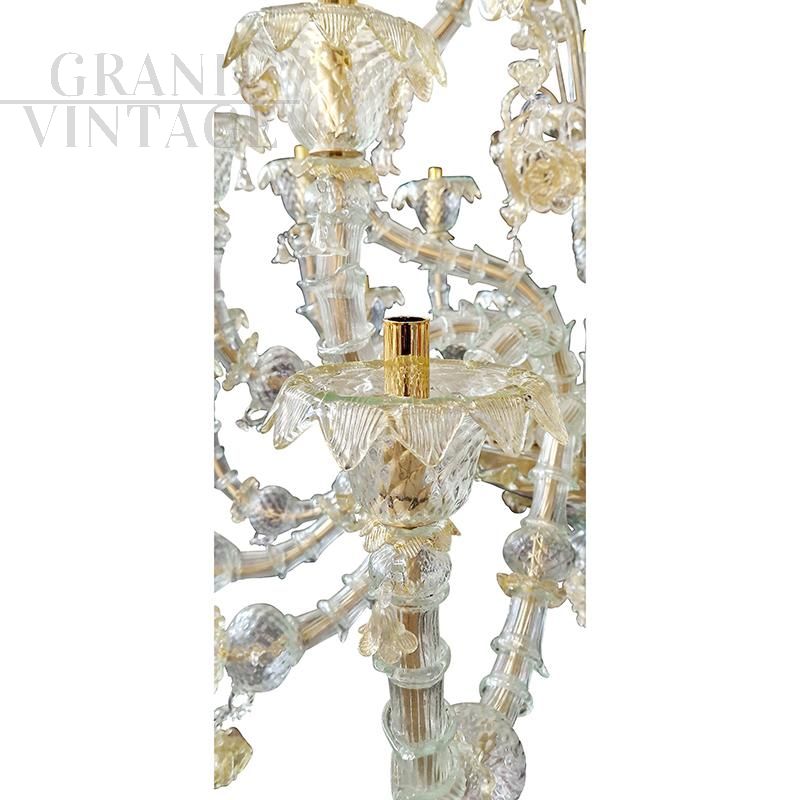 Grande e sontuoso lampadario in vetro di Murano artistico nello stile di Rezzonico in vetro di Murano soffiato e lavorato a mano con tecnica antica, molto luminoso grazie ai suoi 20 punti luce, Italia anni '30 - '40. Si distingue per la pregiata decorazione in cristallo oro e i preziosi dettagli di fiori e foglie rifiniti a mano dai maestri vetrai Muranesi.