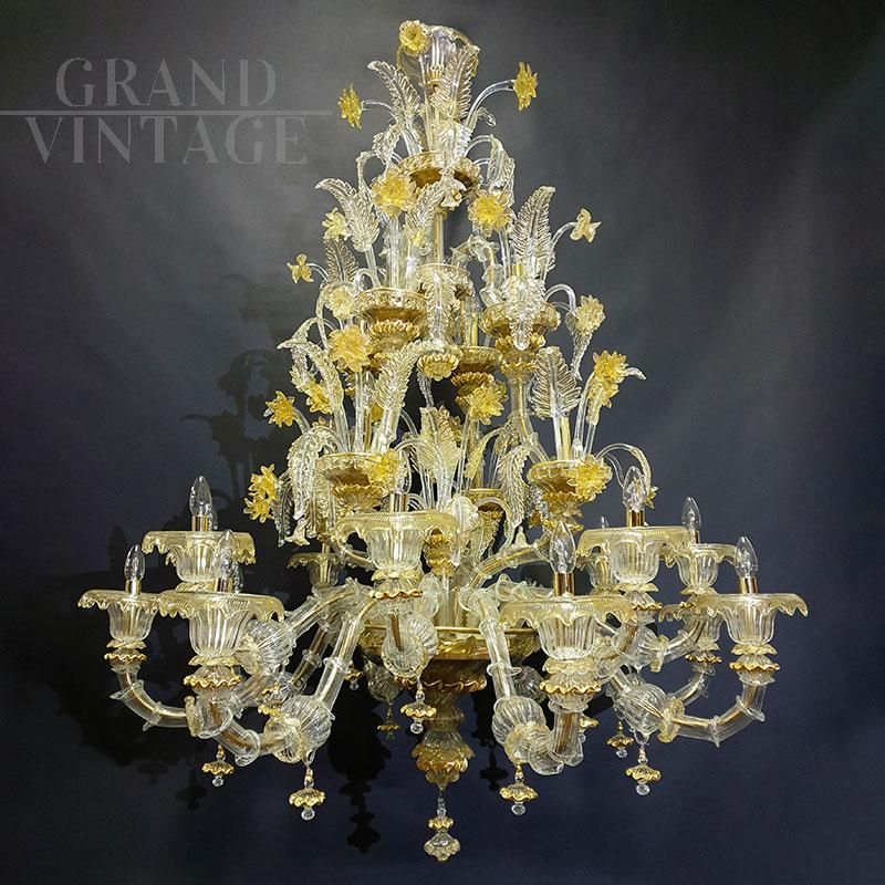 Lampadario in vetro di Murano, stile Rezzonico, soffiato e lavorato a mano con tecnica antica. Su ogni braccio in metallo dorato sono infilati, pezzo per pezzo, i vetri detti “bossole” realizzati a “rigadin” (striature longitudinali o spiroidali) che compongono il lampadario. Questo modello, interamente realizzato a mano dai maestri muranesi, è caratterizzato da pregiate decorazioni in Cristallo Oro e impreziosito con raffinati dettagli di foglie, fiori gialli, coppe e riccioli. Presenta un sistema composto da 24 luci organizzate su più ordini, con attacchi per lampadine di tipo E14, adatti per lampadine a led.
