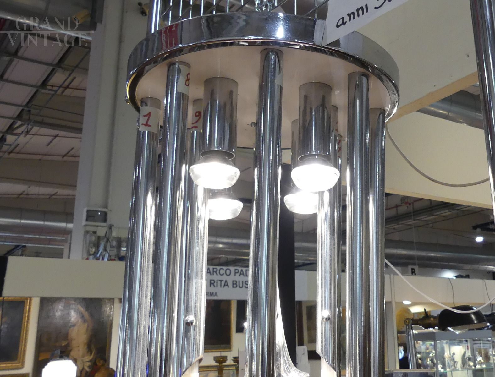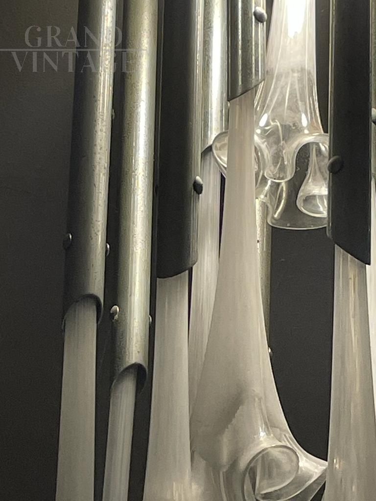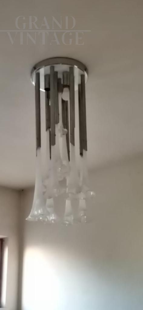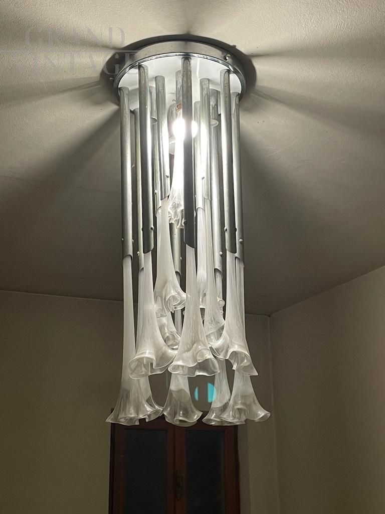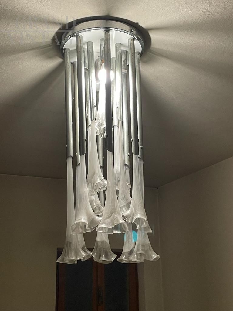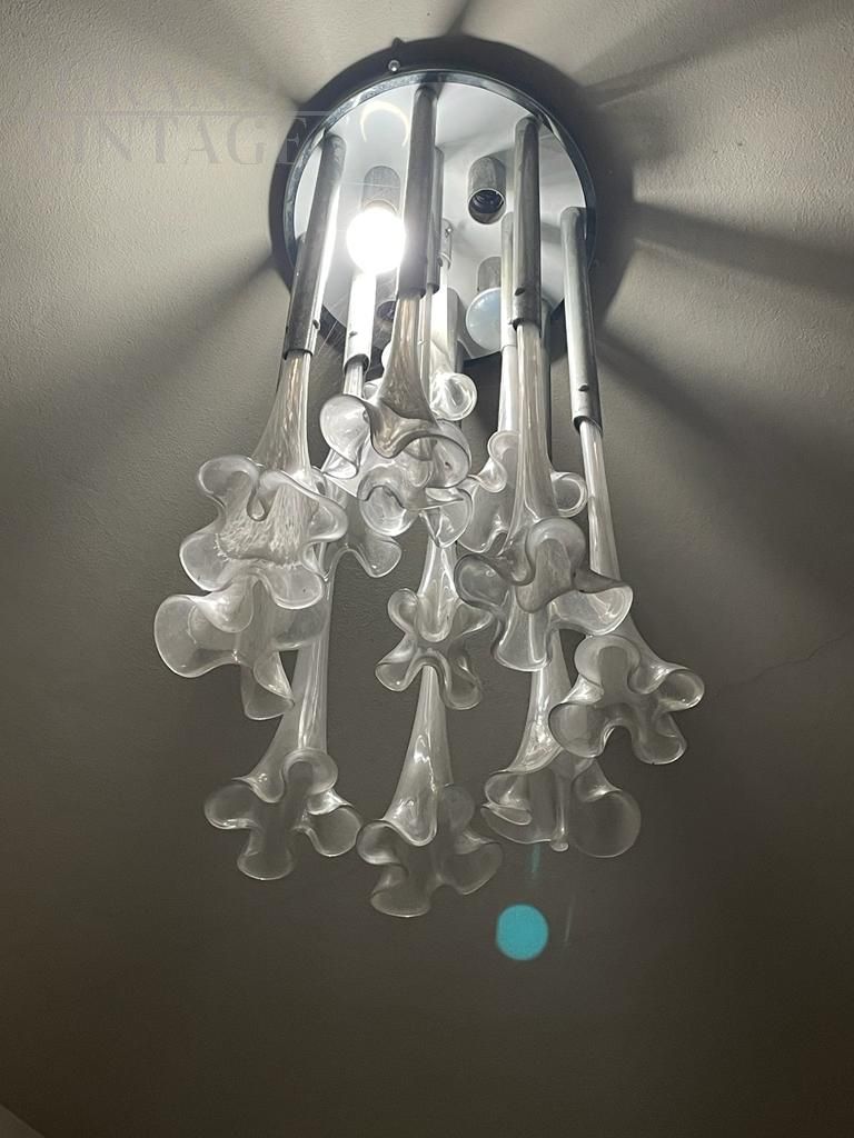 Lampadario Venini in vetro di Murano trasparente e bianco con 16 vetri con forme floreali che ricordano le calle. Supporto in metallo cromato, completa di 4 punti luce, in ottime condizioni.