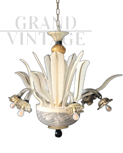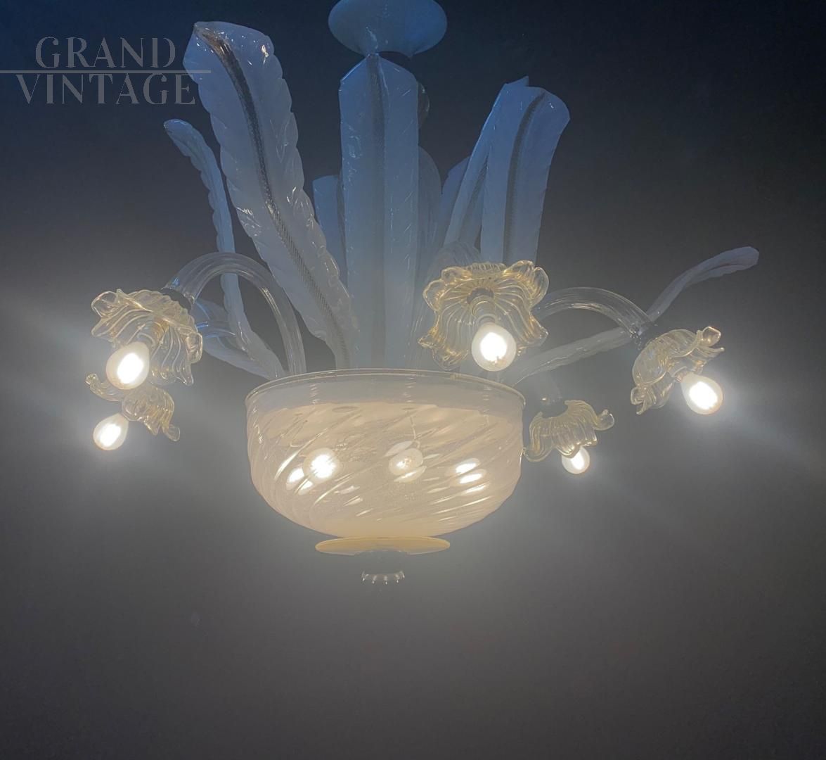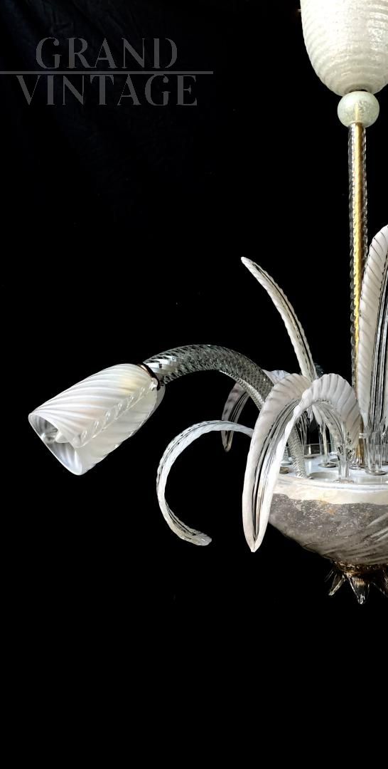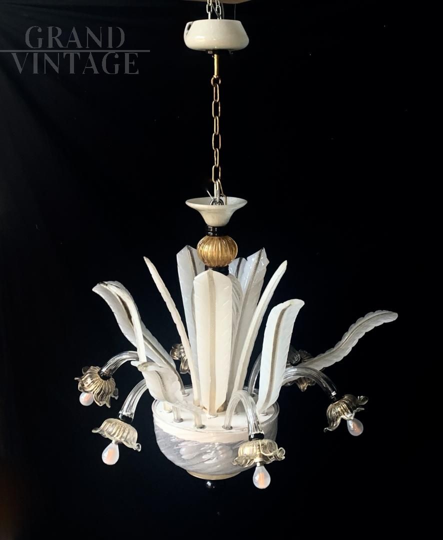 Bellissimo lampadario in vetro di Murano bianco attribuibile alla ditta Seguso, anni '60, con 6 luci esterne e diverse all'interno della coppa. Il lampadario è di medie dimensioni, ha una linea bella e delicata. Il vetro è principalmente pulegoso bianco latte con oro, e in parte trasparente con decorazioni di colore nero. Struttura in ottone e ferro, vetri originali anni '60 circa intatti, non crepati, tutti removibili dalla struttura. Pochi segni del tempo, impianto elettrico rifatto e adatto all'uso di lampadine a Led E14. Non abbaglia se vengono montate lampadine bianco latte