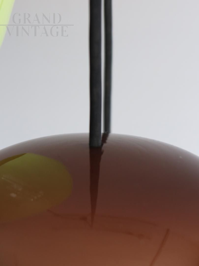 Lampada a sospensione italiana disegnata da Massimo Vignelli per Venini, diffusori in vetro colorato incamiciato e struttura superiore in ottone lucido, 1955 ca.