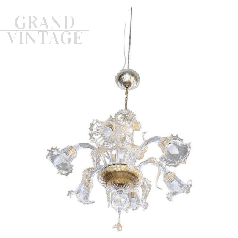 Questo squisito lampadario italiano, realizzato in vetro di Murano negli ultimi decenni del XX secolo, è una vera e propria testimonianza dell'abilità dei rinomati vetrai muranesi. Con ogni dettaglio meticolosamente progettato, questo lampadario è un pezzo eccezionale che incarna eleganza e raffinatezza. Presenta la firma della storica fornace muranese La Murrina. Il lampadario presenta una delicata decorazione floreale, con fogliame intricato e piccoli fiori tra i bracci. L'uso del vetro trasparente conferisce un'aria di leggerezza, mentre i raffinati accenti dorati, ottenuti incorporando la polvere d'oro nel vetro, ne esaltano la bellezza. Prezzo trattabile.