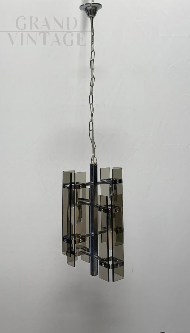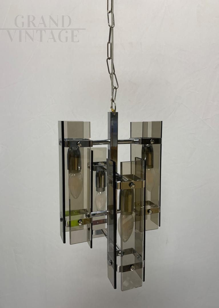Fantastico lampadario degli anni '70 circa con vetri fumé molati a mano, attribuito alla ditta Veca, tutto originale, con pochissimi segno del tempo, impianto elettrico rifatto e funzionante. Meraviglioso vetro fumè trasparente, ogni vetro si smonta dalla struttura portante in ferro. I vetri non sono crepati. Ottimo elemento che può arredare diverse stanze: dalla cucina alla sala, dall'entrata alla camera e bagno. Il lampadario ha 4 punti luce con attacchi per lampadina di tipo E14 a oliva, si consiglia l'utilizzo di lampadine al Led. Nel prezzo è compreso anche il restauro eseguito da artigiani specializzati in questo mestiere da oltre 30 anni.