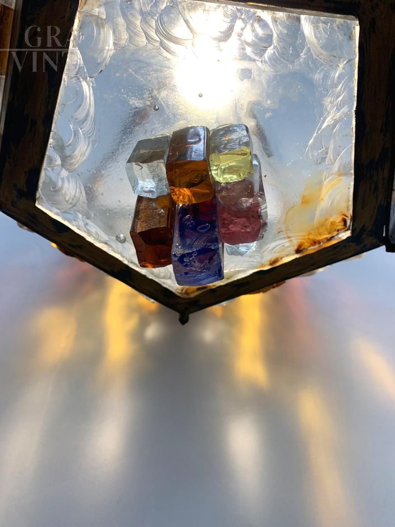 Lampadario lanterna Longobard brutalista in vetro di Murano e ferro battuto