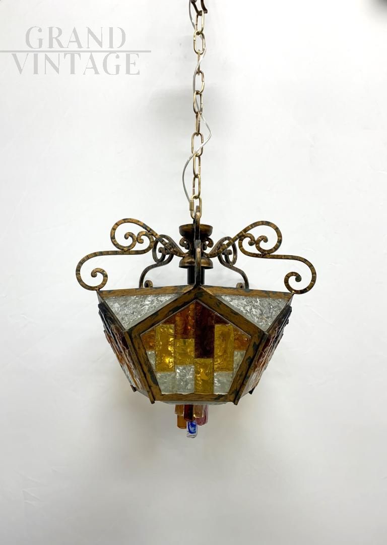 Magnifico lampadario a lanterna attribuibile alla ditta Longobard in stile brutalista composto da diversi vetri di Murano molati a mano con una struttura portante in ferro battuto a mano. Tutti i vetri sono diversi, lavorati e tagliati a mano a Murano, in diverse sfumature del giallo e dell'arancione, ulteriormente è stato dipinto a mano. In ottime condizioni, con impianto elettrico rifatto a nuovo con attacco per una lampadina di tipo E27. Ottimo elemento perfetto per illuminare diverse stanze: dalla cucina alla sala, dall'ingresso al bagno. L'altezza della catena è regolabile. Si consiglia l'utilizzo di lampadine al led.