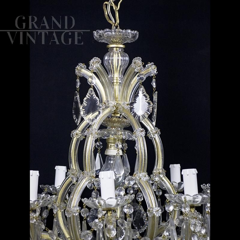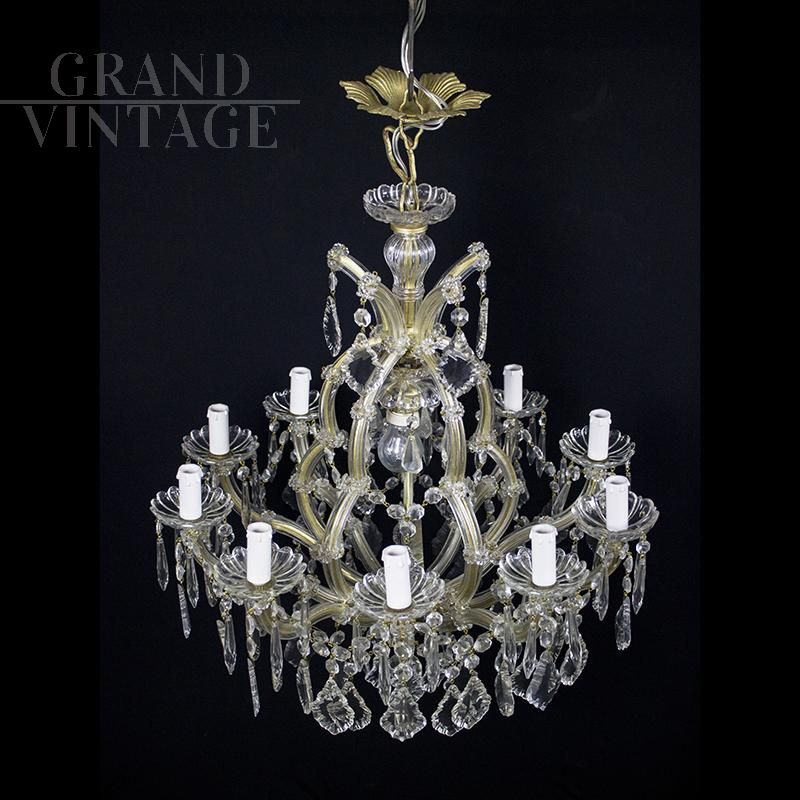 Lampadario Maria Teresa a 10 luci in cristallo di Boemia. Architettura a cesta con singolo palco e cimiero ornamentale. Telaio metallico rivestito in cristallo, finiture e dettagli colore oro e bianco. Allestimento con cristalli al piombo molati e sfaccettati legati a occhiello. Impianto luci completamente funzionante.