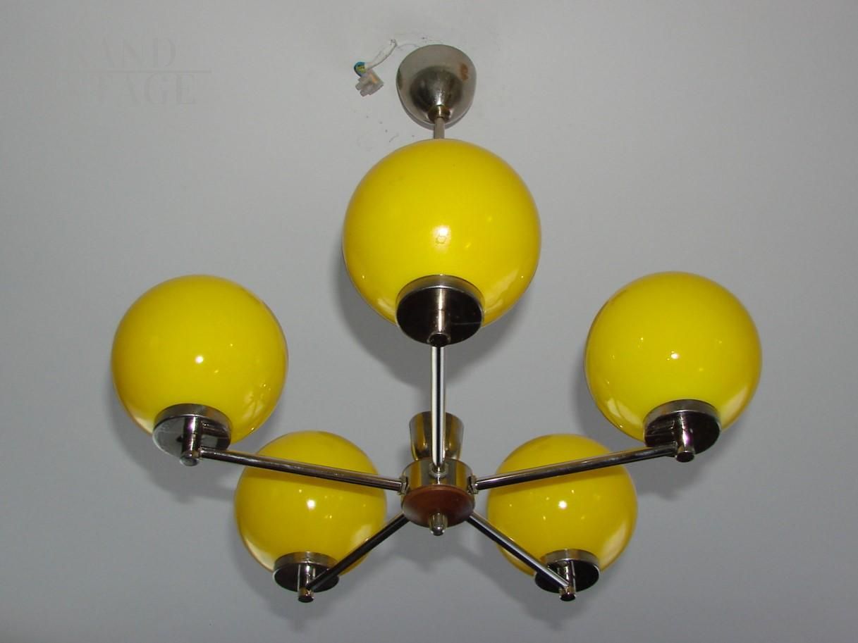 Lampadario modernariato anni '60 con 5 sfere gialle
