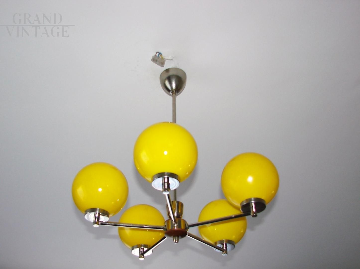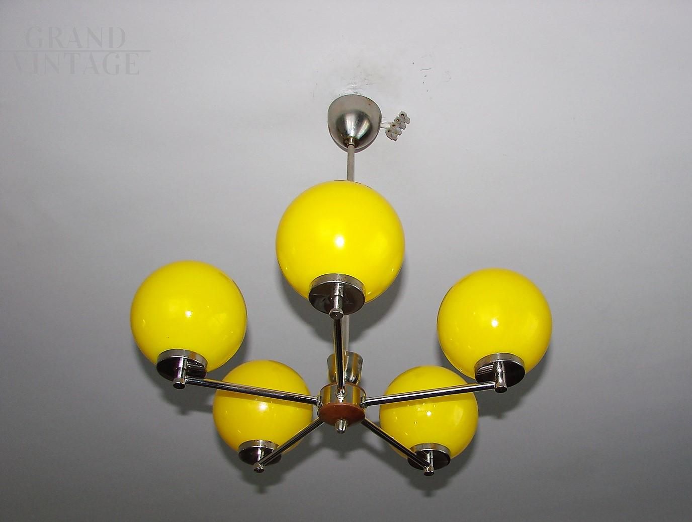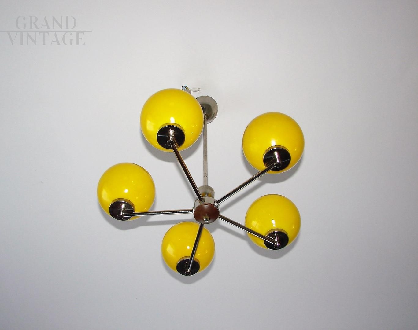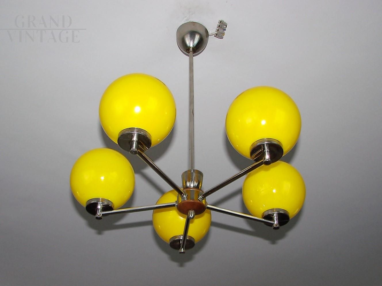 Lampadario vintage modernariato anni '60 con struttura in metallo nichelato e 5 sfere paralume in vetro giallo. Il lampadario necessita di 5 lampadine E14.