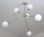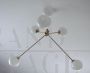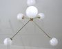 Lampadario modernariato Sputnik anni '60 con struttura in ottone e 6 lucicon paralume in vetro bianco. Il lampadario è in ottime condizioni e necessita di 6 lampadine E14. Dimensioni: altezza 80 cm, larghezza 90 cm, profondità 90 cm.