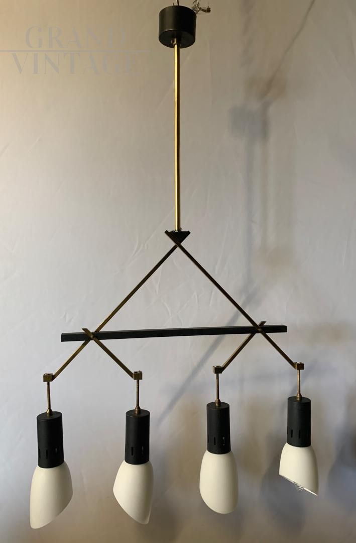 Bellissimo lampadario orizzontale design attribuito a Stilnovo con 4 punti luce in vetro di Murano bianco soffiato con struttura in ottone e lamiera nera. In ottime condizioni, restaurato lasciando la sua patina e il colore nero originale, funzionante con impianto elettrico nuovo, con 4 attacchi per lampadine di tipo E14, adatti per lampadine al Led. Il lampadario ha un design moderno ed è adatto per illuminare gli arredamenti di oggi. Nel prezzo dell'oggetto è compreso anche il restauro, eseguito da personale competente e qualificato da oltre 40 anni.