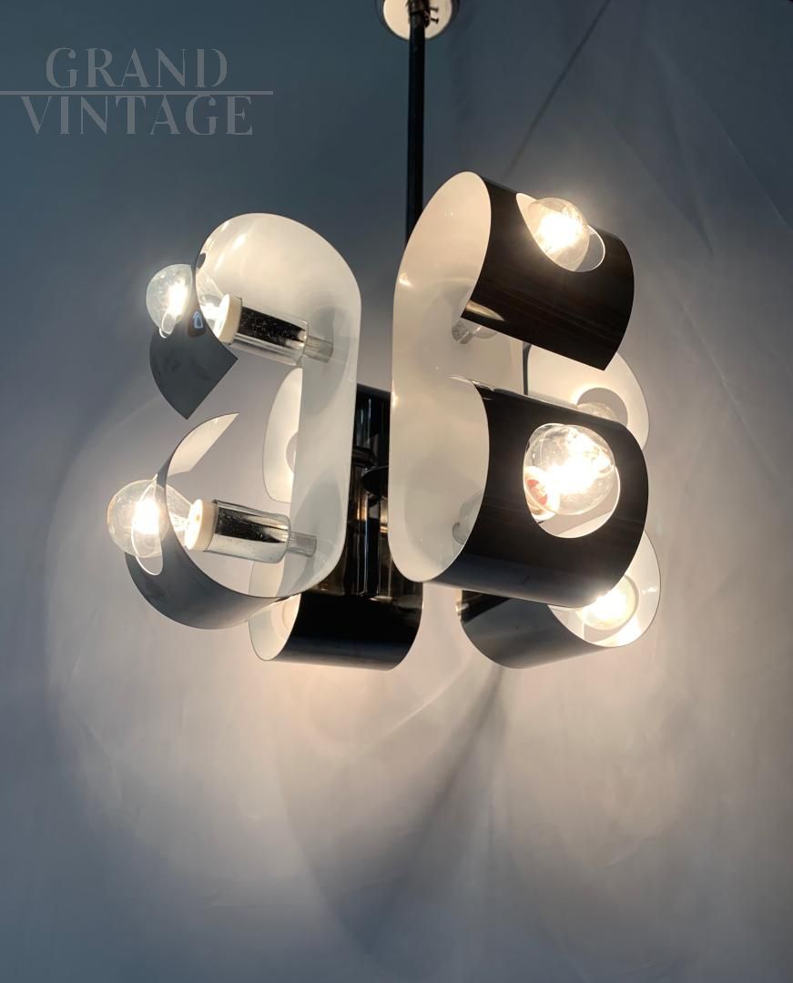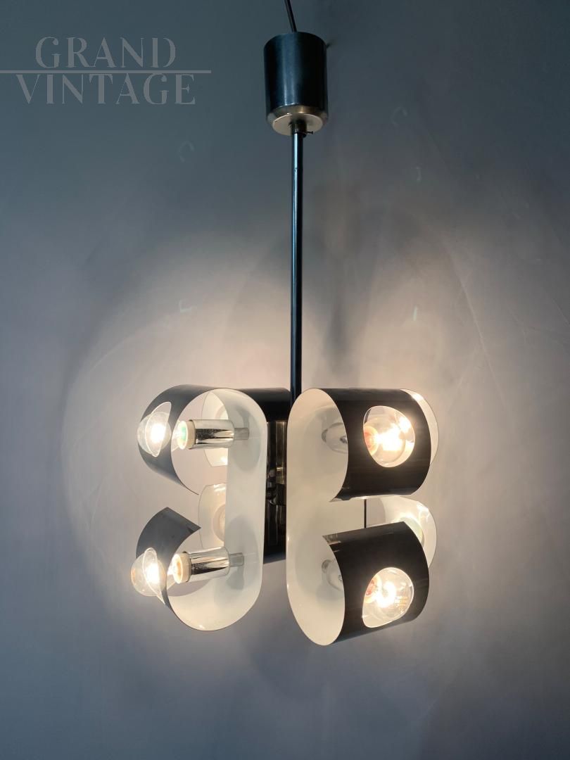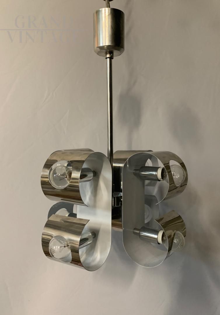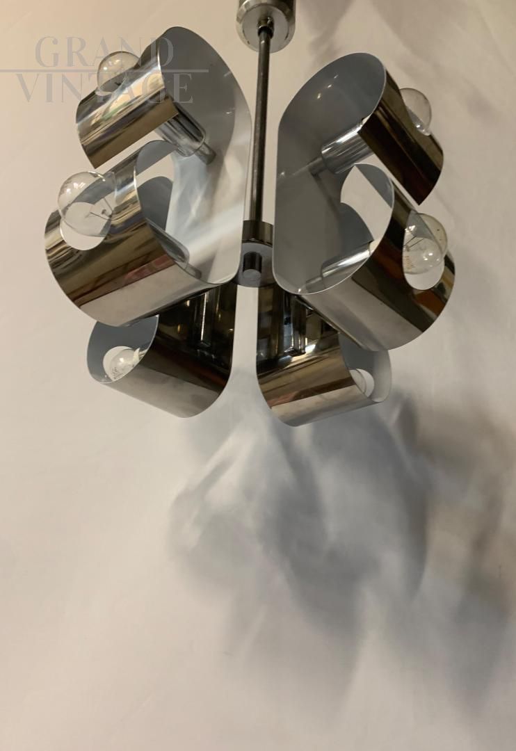 Lampadario Reggiani cromato a 8 luci, space age anni '70