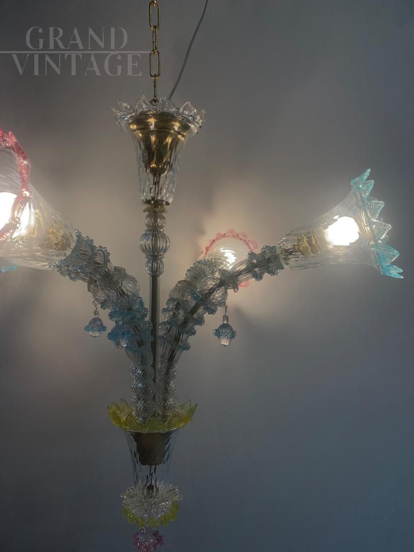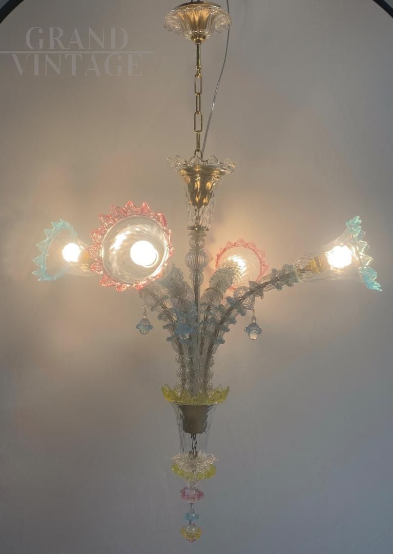 Bellissimo lampadario Rezzonico attribuito alla ditta Seguso in vetro artistico di Murano trasparente e nei colori azzurro, rosa, giallo e oro colorato a mano. Di medie dimensioni, il lampadario è completo di 4 punti luce. La struttura è in ottone e ferro, i vetri sono originali degli anni '60, intatti e non crepati. Impianto elettrico rifatto a nuovo con 4 attacchi per lampadine di tipo E27, adatti per le lampadine al Led. In ottime condizioni, con pochi segni del tempo. Ottimo pezzo per illuminare diverse stanze: sala cucina o anche tavoli; non abbaglia se vengono montate lampadine bianco latte.