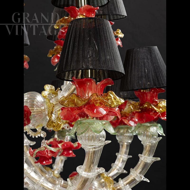 Lampadario Rezzonico in vetro di Murano bianco oro e rosso con paralumi neri
