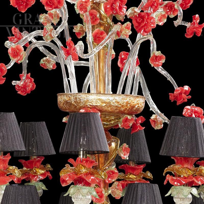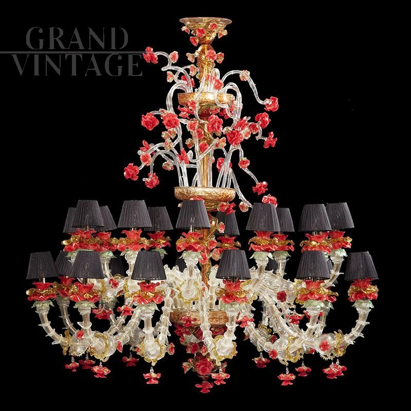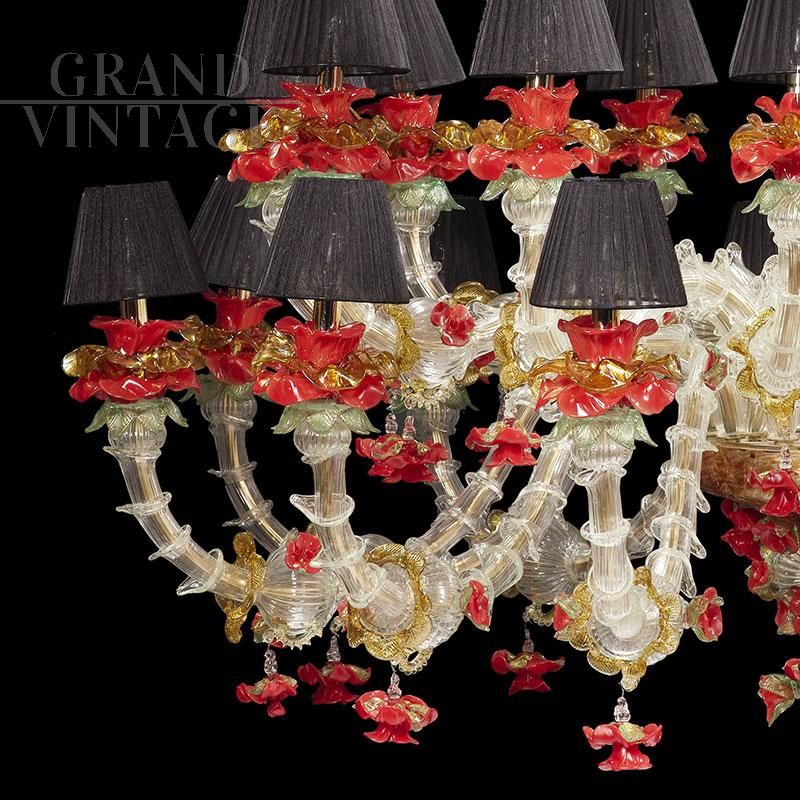 Lampadario in vetro di Murano in stile Rezzonico, soffiato e lavorato a mano con tecnica antica. Su ogni braccio in metallo dorato sono infilati, pezzo per pezzo, i vetri detti “bossole” realizzati a “rigadin” (striature longitudinali o spiroidali) che compongono il lampadario. Questo modello interamente realizzato a mano dai maestri muranesi è caratterizzato da pregiate decorazioni in Cristallo Oro e impreziosito con raffinati dettagli di foglie, fiori rossi, coppe e riccioli. Presenta un sistema composto di 24 luci organizzate su due ordini, i 24 punti luce presentano attacchi per lampadine di tipo E14 compatibili con lampadine a led.