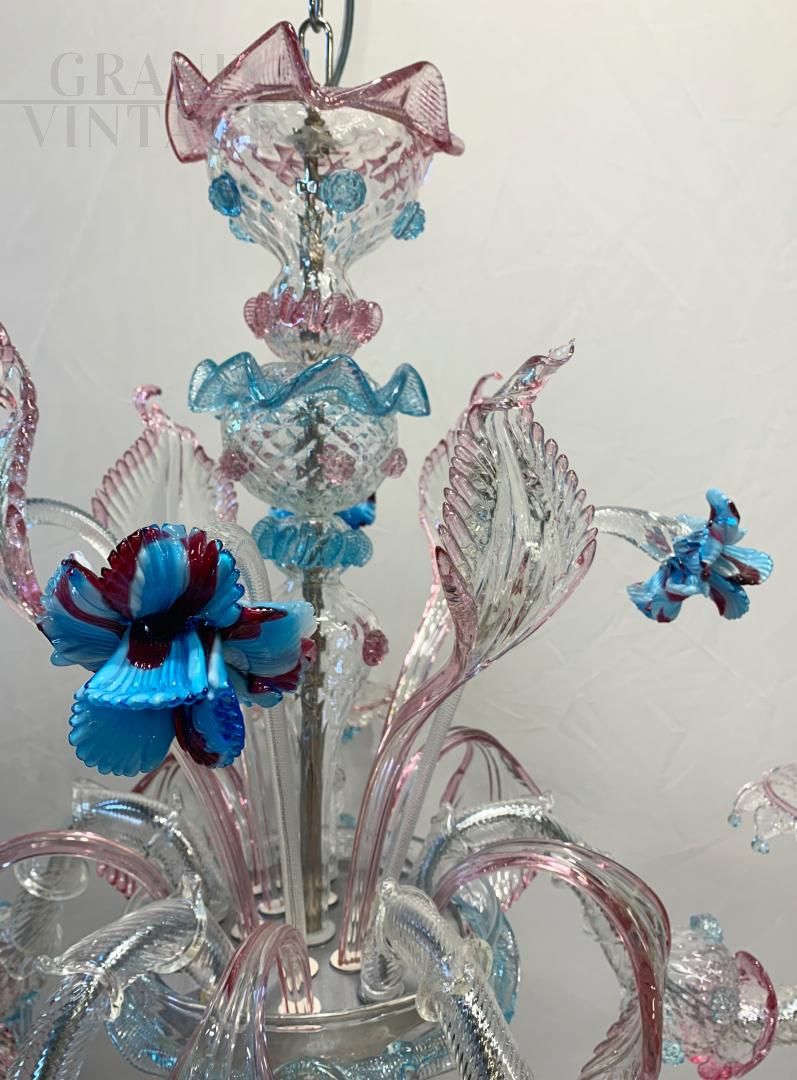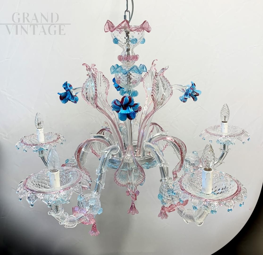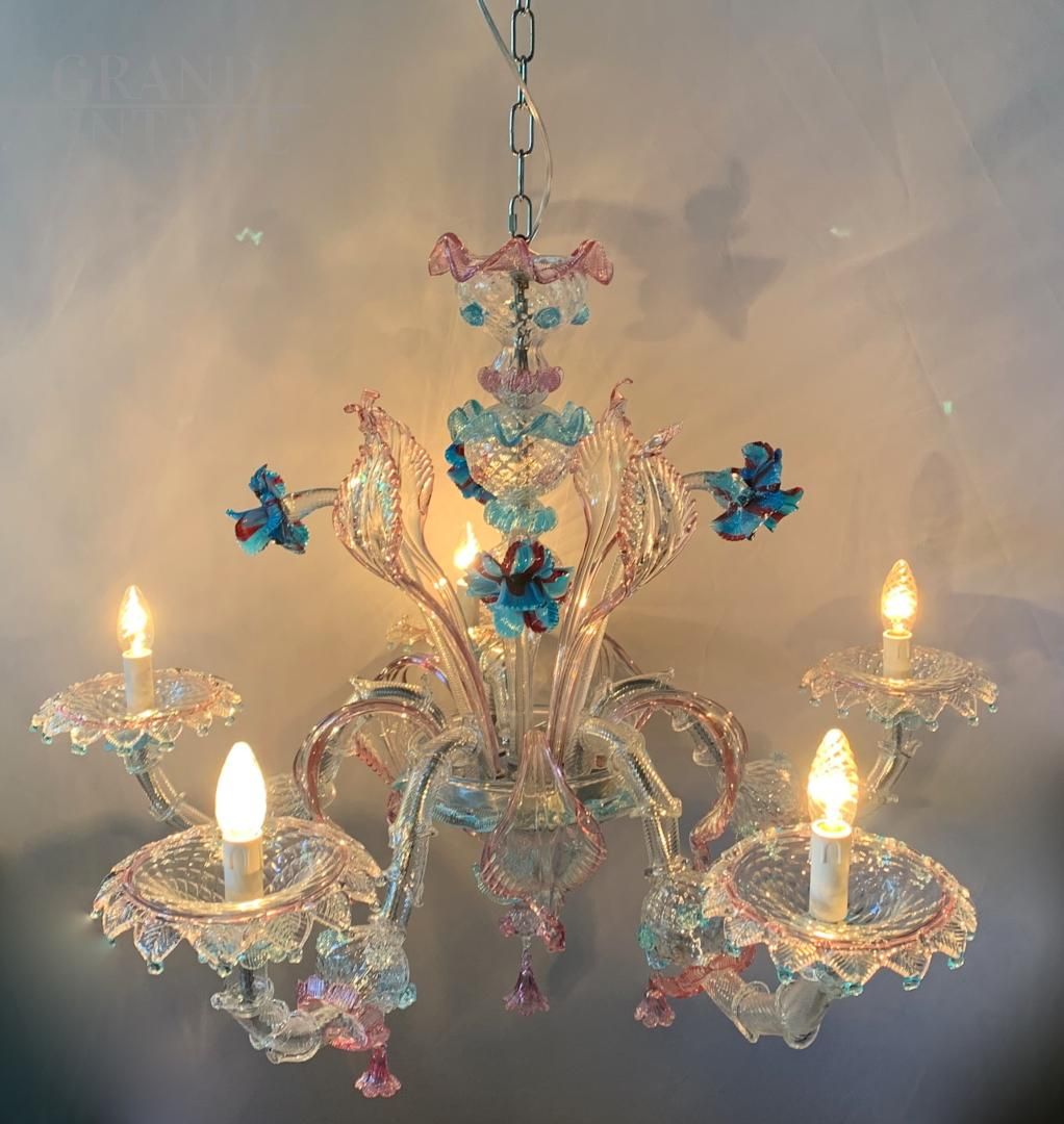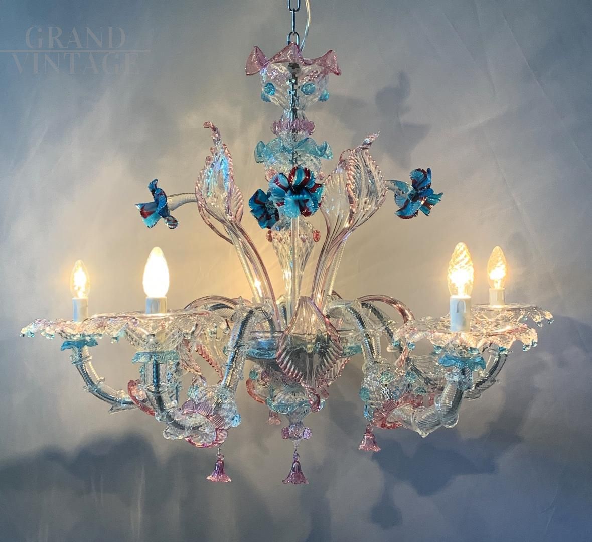 Bellissimo lampadario in vetro di Murano Rezzonico con 5 luci probabilmente lavorazione della ditta Cesare Toso, di medie dimensioni. Struttura in ottone e ferro, vetri originali anni 1970 circa. Tutto il lampadario è costituito da un'opera d'arte, con diversi vetri colorati lavorati a mano. ed è costituito da 5 punti luce per lampadine E14. Vetri intatti, non crepati. Pochi segni del tempo.